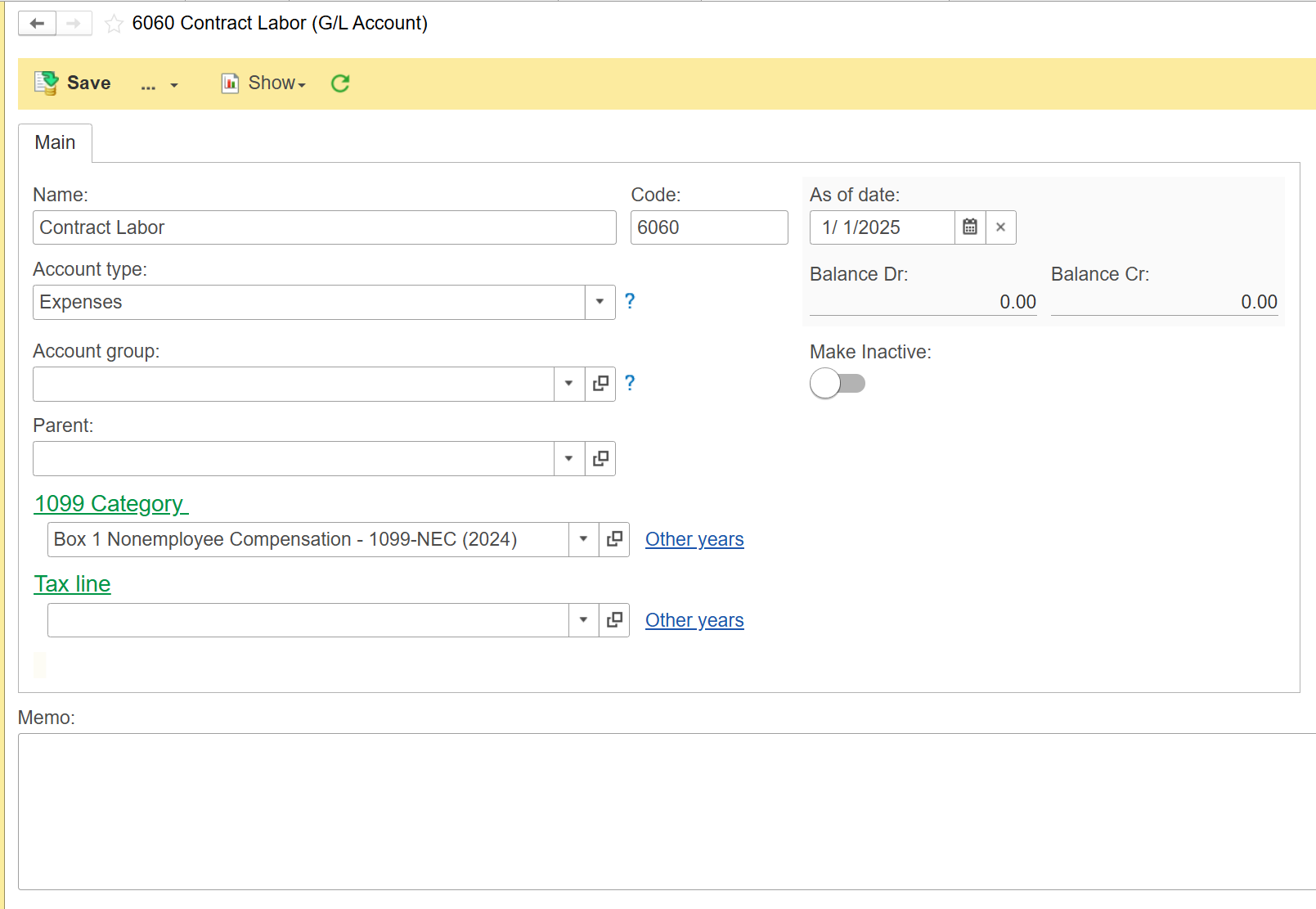 Any accounts that are used to track 1099 related expenses will need to have a 1099 category assigned to them. This step may have been completed when the chart of accounts was created for your company. If you are not sure, please consult with your CPA or Accountant.