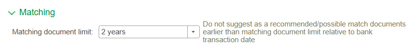 - Matching document limit: Define how far back the system should search for a matching document (e.g., "2 years"). The system will not suggest matches for documents older than this limit relative to the bank transaction date.