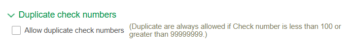 Note: Even if unchecked, duplicates are always allowed for check numbers less than 100 or greater than 99,999,999.
