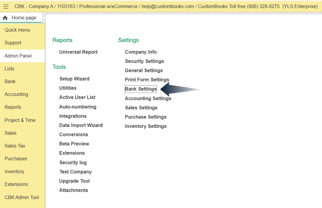 - Via Bank Menu: Go to Bank → Bank Settings.