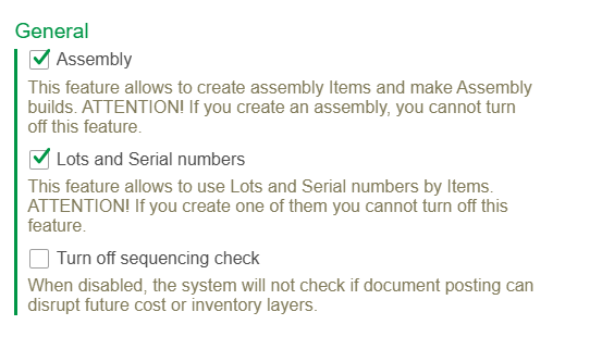 Lots and Serial numbers: Enables tracking items by specific Lot or Serial numbers.