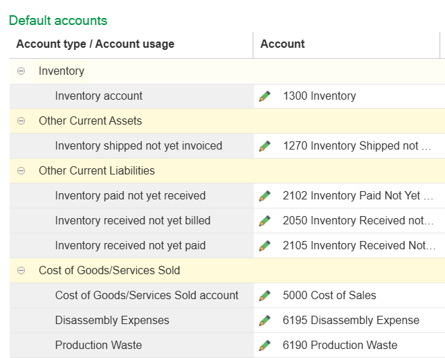 - Cost of Goods/Services Sold: Cost of Goods/Services Sold account, Disassembly Expenses account, and Production Waste account.