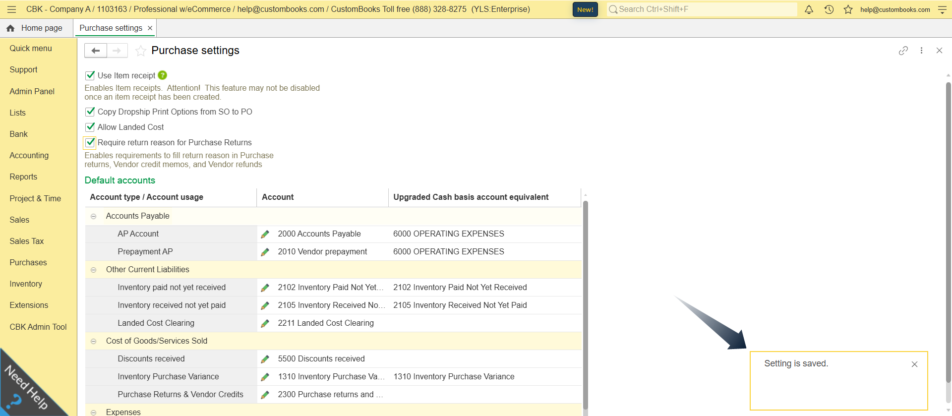 The Purchase Settings in the CustomBooks™ Admin Panel allow you to customize your purchasing workflows, enable advanced inventory tracking features like Landed Cost and Item Receipts, and map default General Ledger accounts to ensure accurate financial reporting.