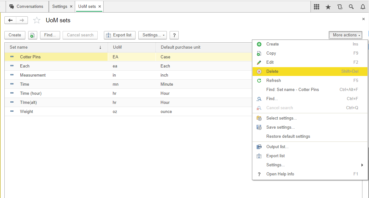 To delete a Unit of Measure Set: