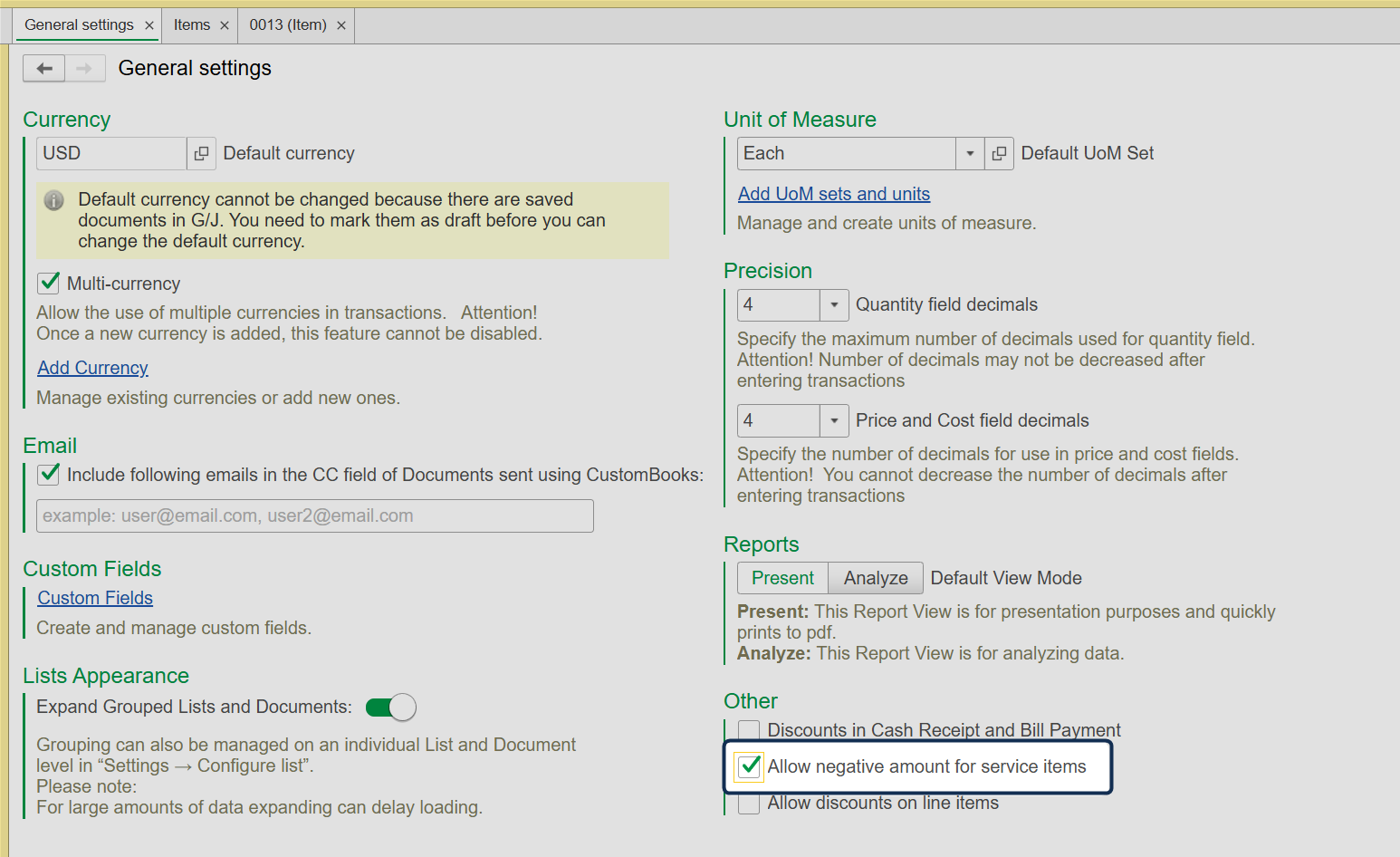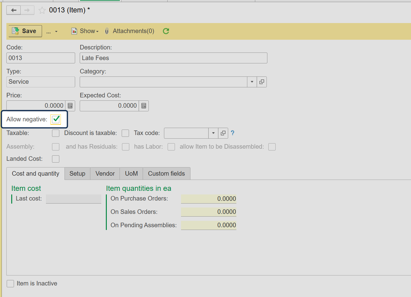 - Enable the feature on the Service Item Card. Go to Lists → Items → Open the specific Service Item you wish to adjust → Enable the Allow Negative checkbox.