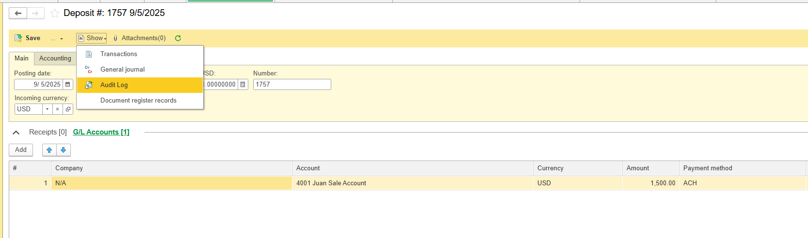 - Open the record (e.g., Item, Customer/Vendor, Sales Invoice, Deposit, Bill).