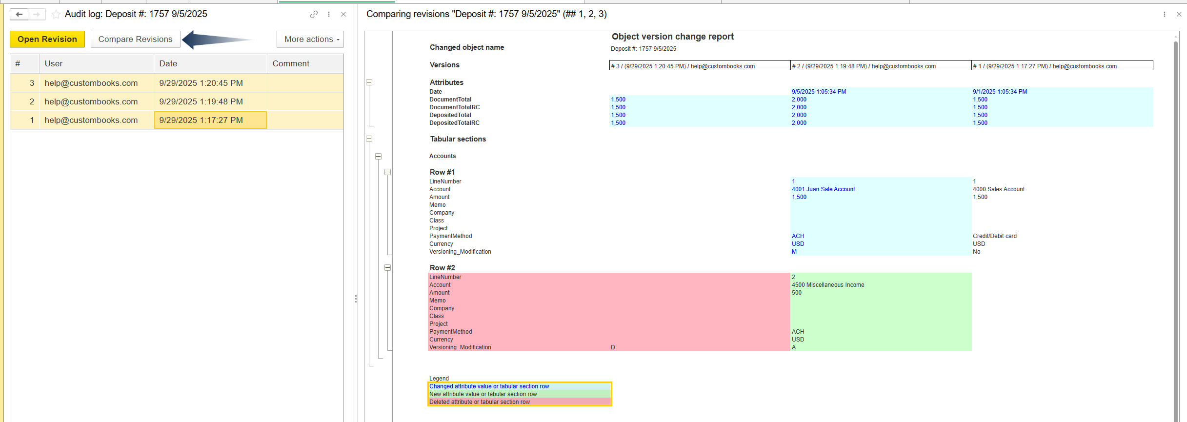 - Compare Revisions: To compare two or more versions, select them using Ctrl + Left Click or Shift + Left Click. Then, click the Compare Revisions button. The Compare Revisions Report (Object Version Change Report) will open, providing a side-by-side comparison of the selected versions.