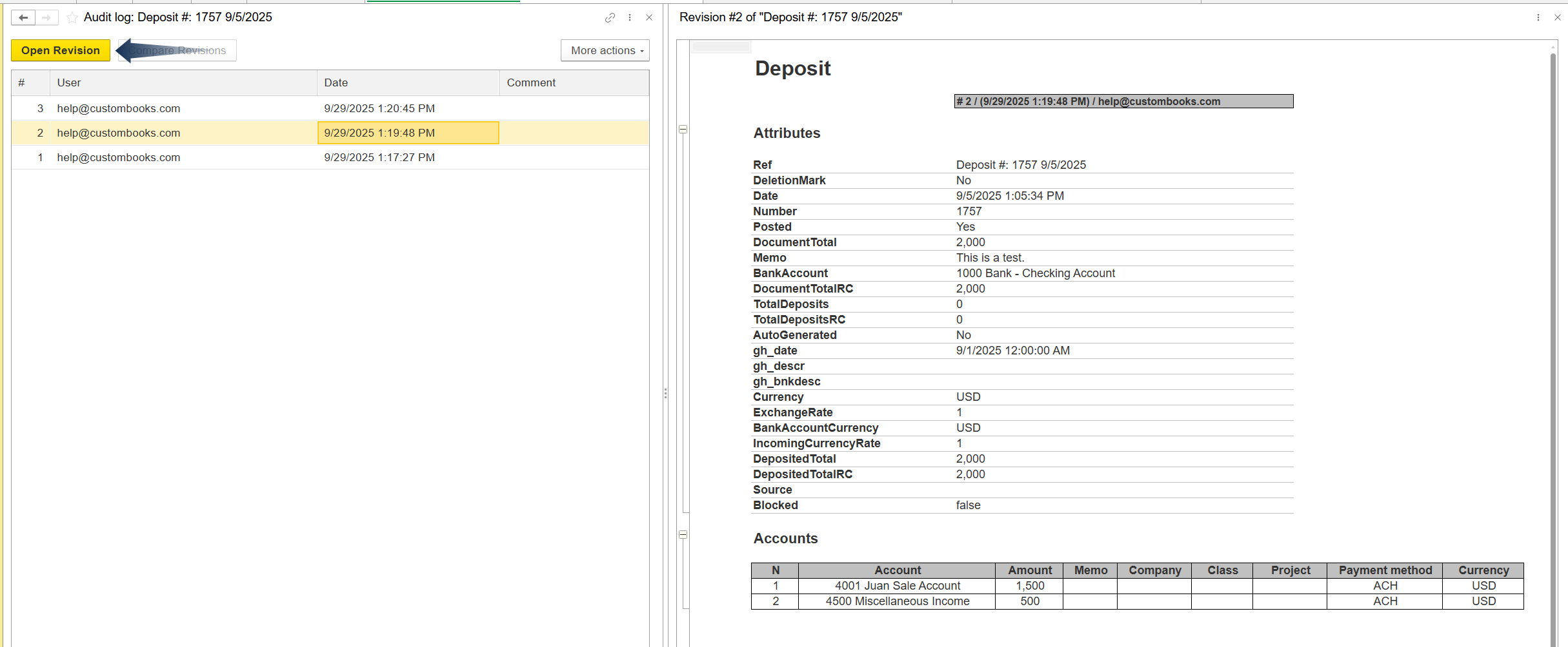 - View Revisions: Select a version and click Open Revision to see the changes for that specific version.