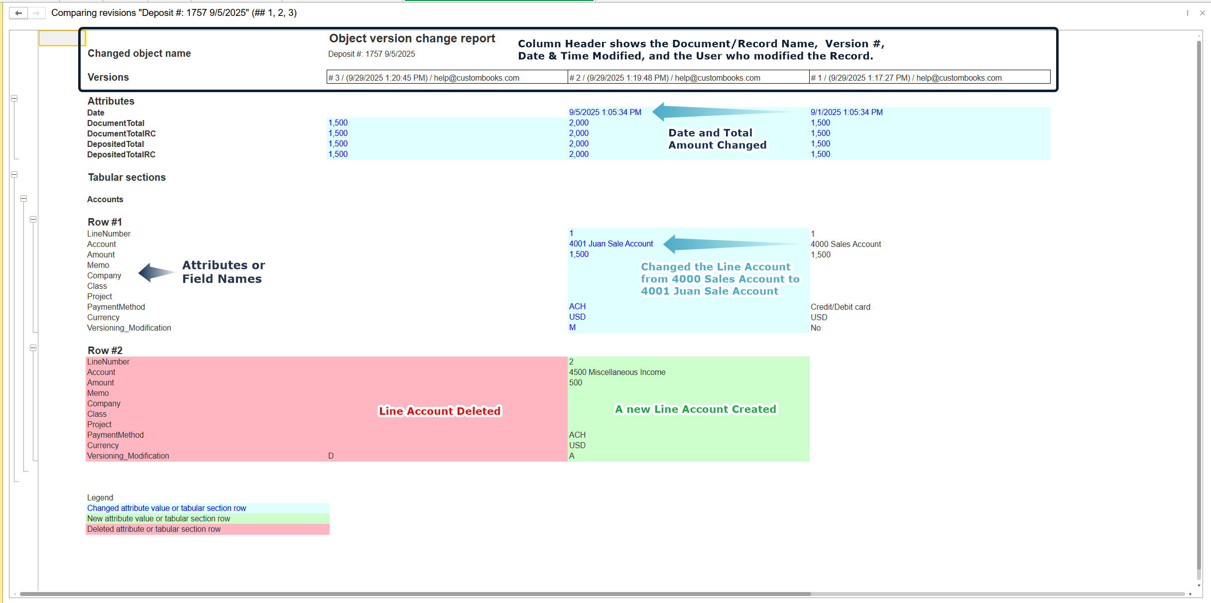To help you understand the Compare Revisions Report better, here is an example of a deposit with three versions being compared.