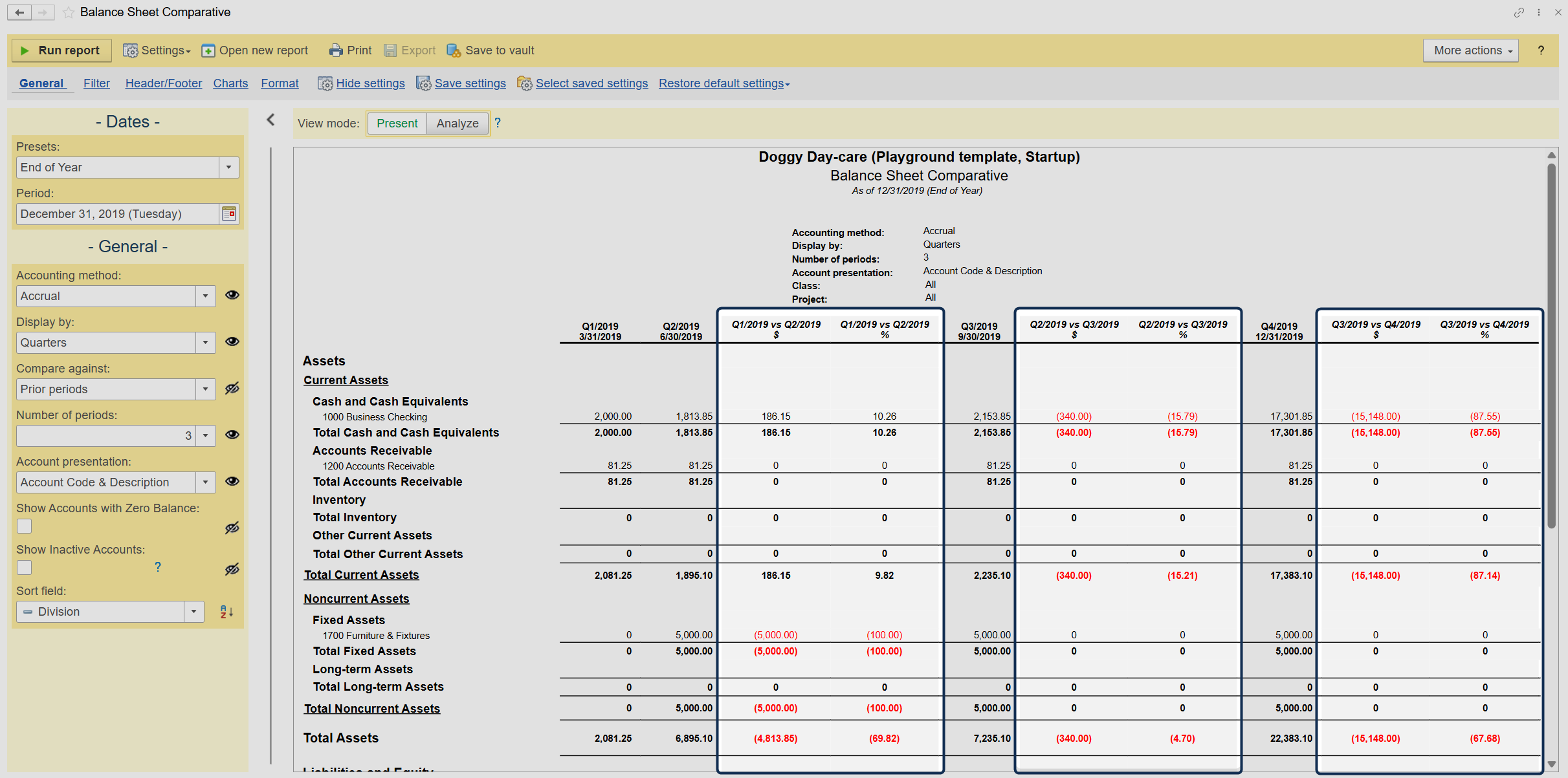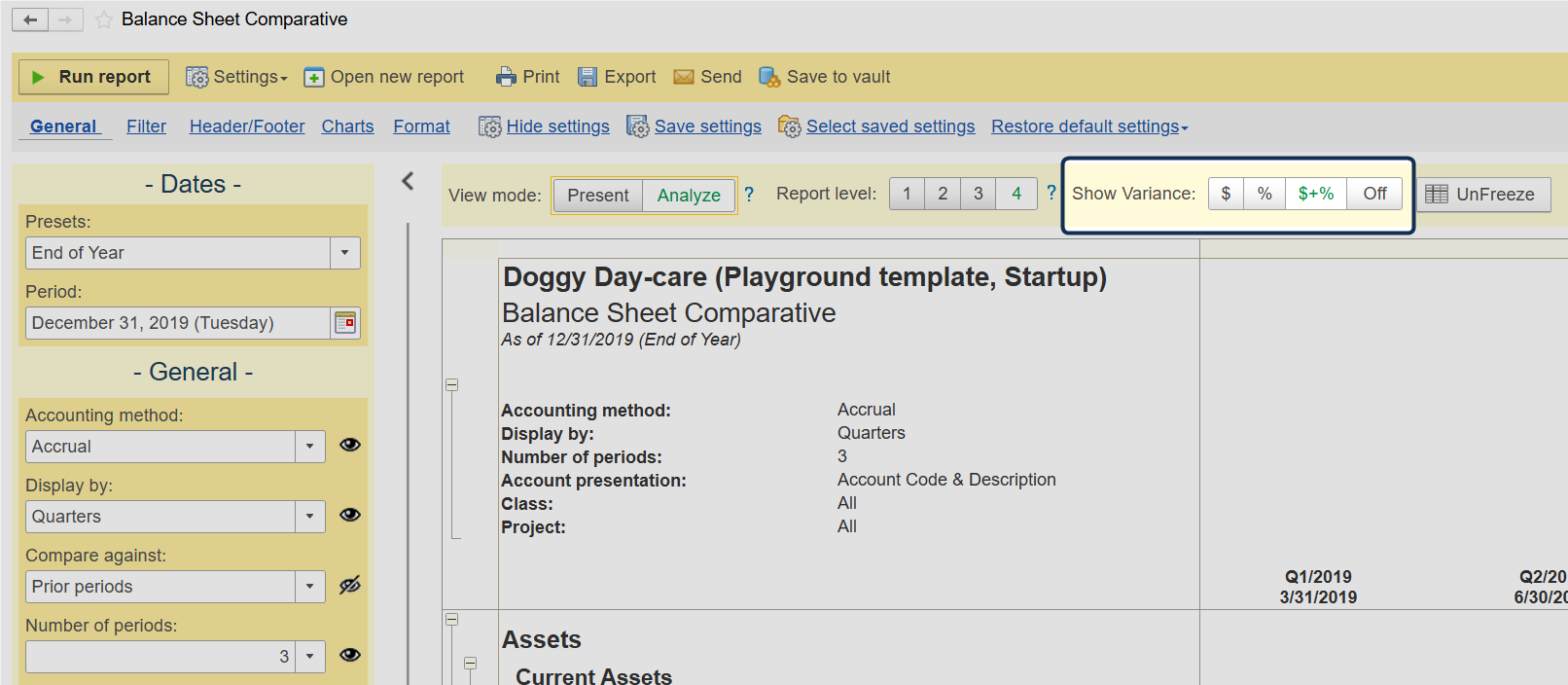 On a balance sheet comparative report, Variances show the difference between a line item's value in the current period compared to a prior period.