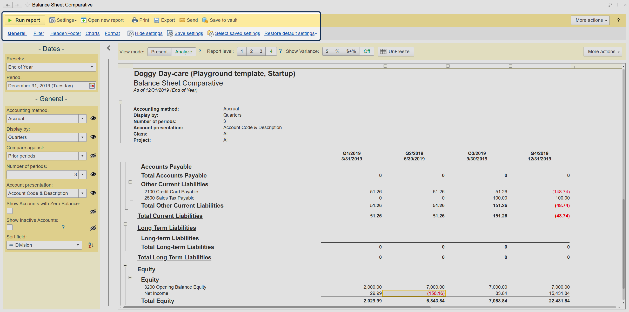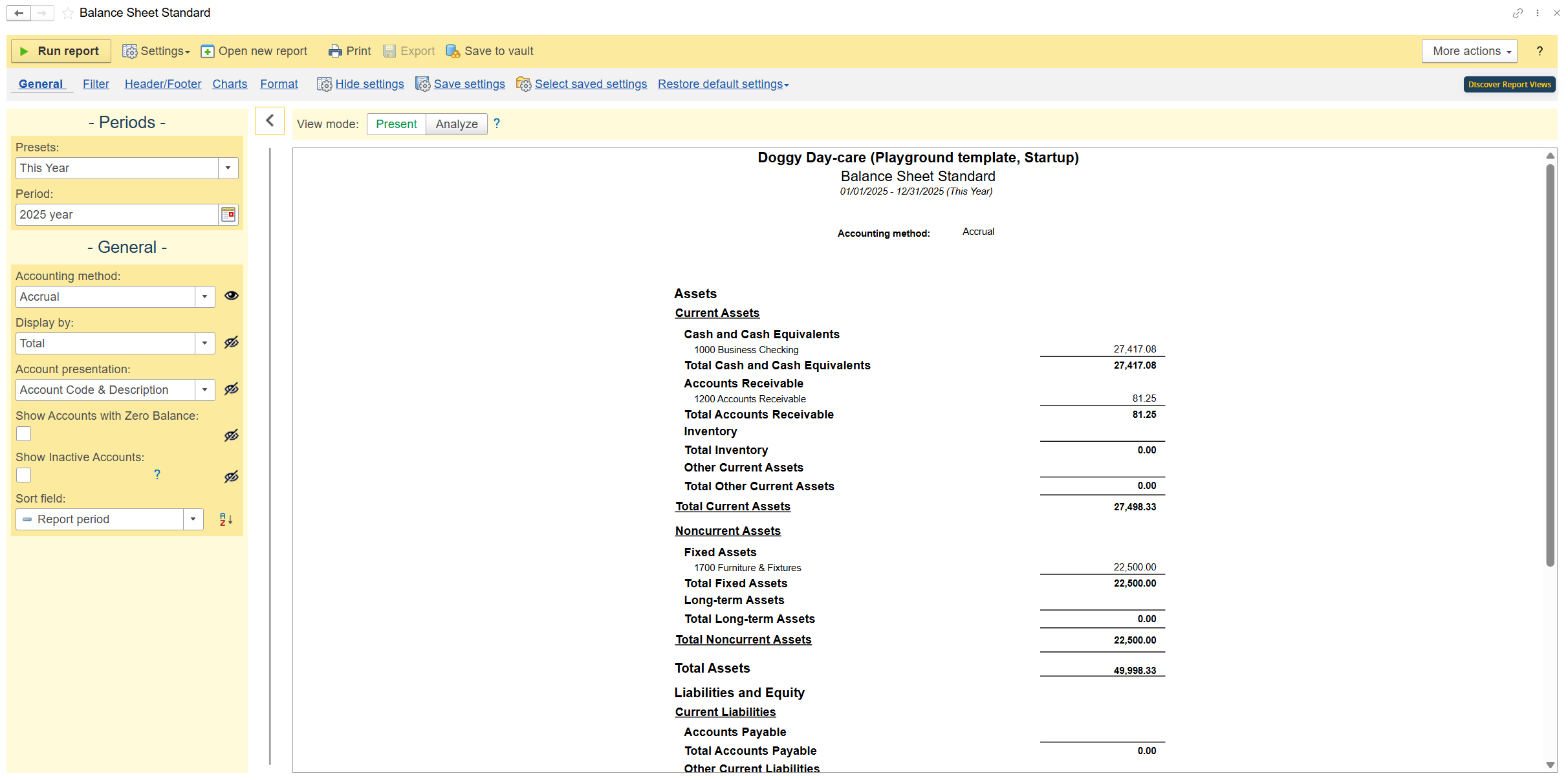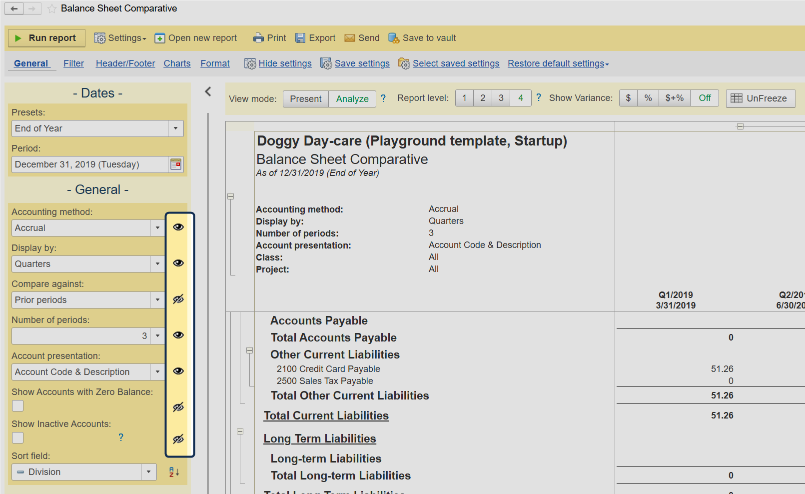 Report settings allow users to customize the content and appearance of the Balance Sheet Reports (Standard and Comparative).