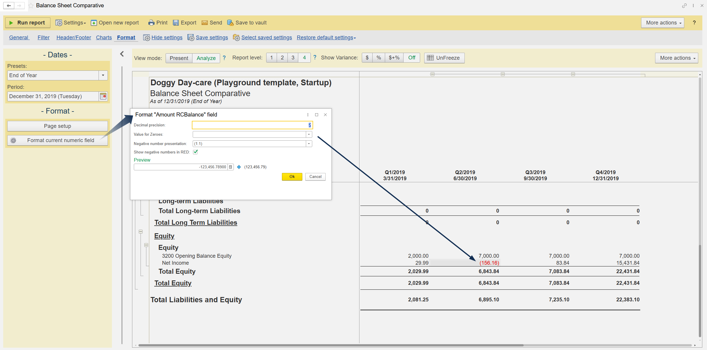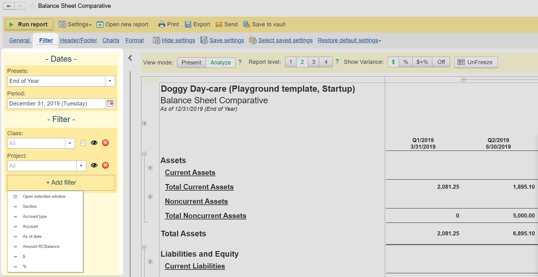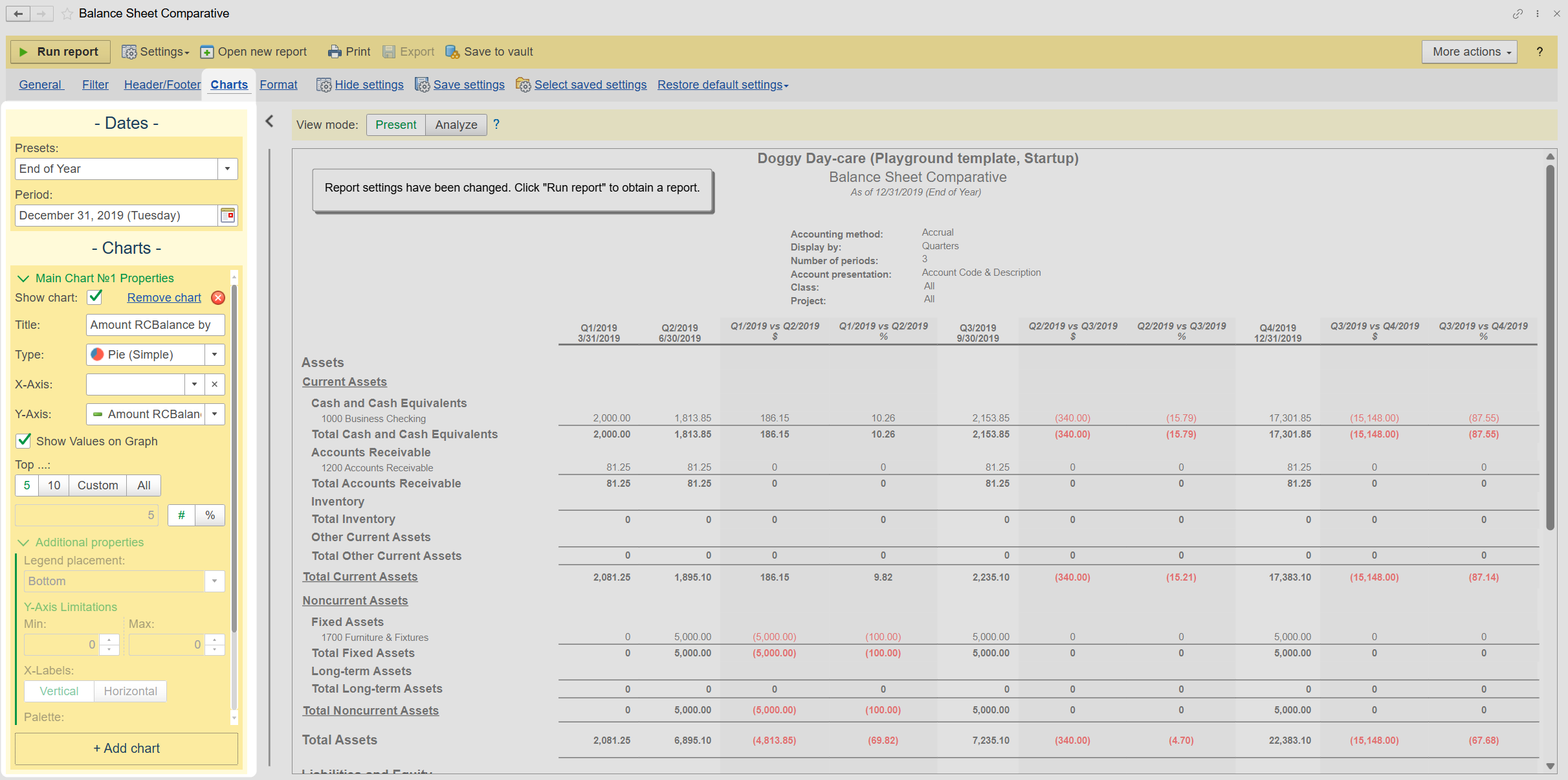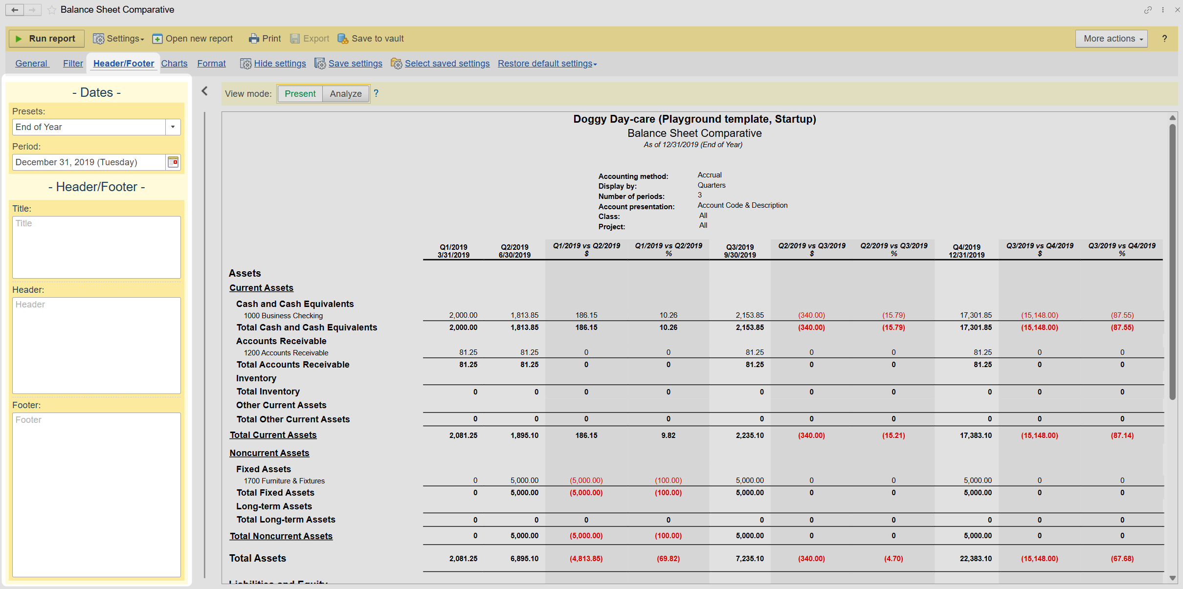 Report settings allow users to customize the content and appearance of the Balance Sheet Reports (Standard and Comparative).