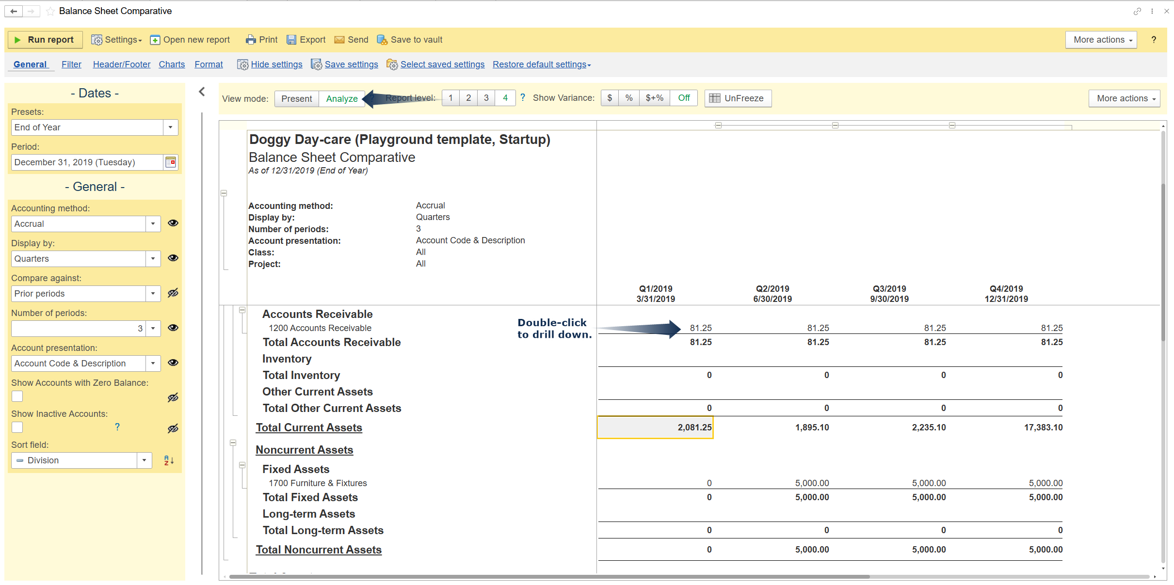 Answer: To drill down into transaction details, you must be in Analyze View Mode. You can double-click the Amount to drill down.