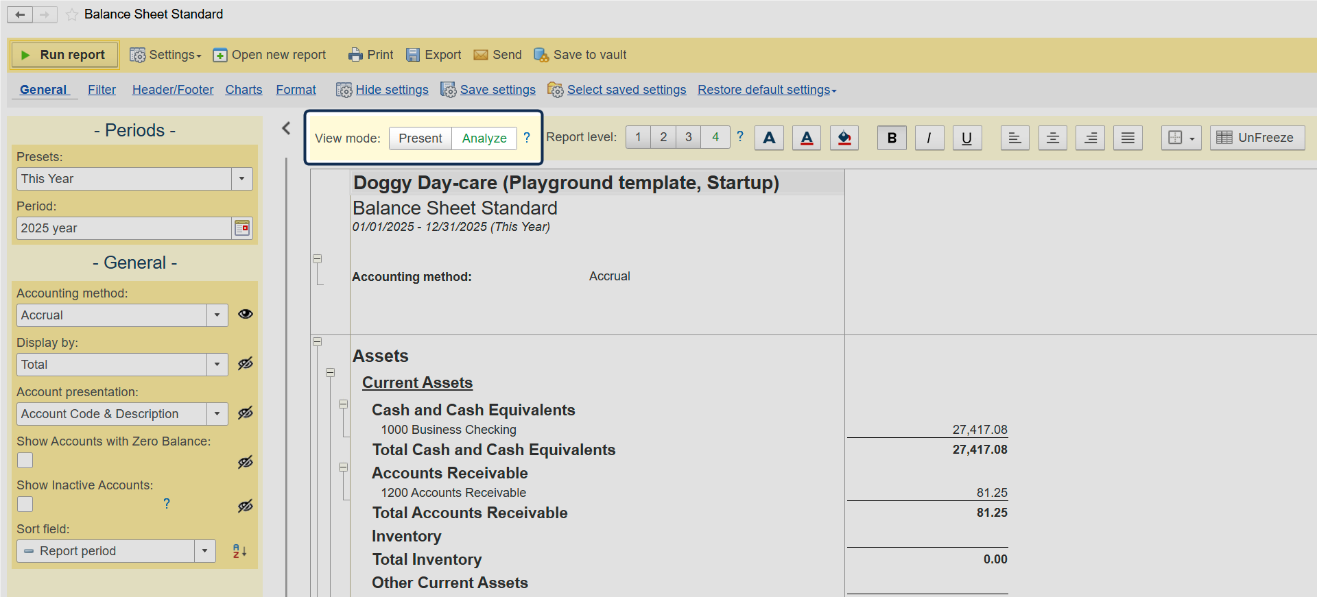 Analyze Mode: Designed for detailed inspection and editing of the data. This is where you can drill down into transaction details, export the report, change formatting, and access all settings.