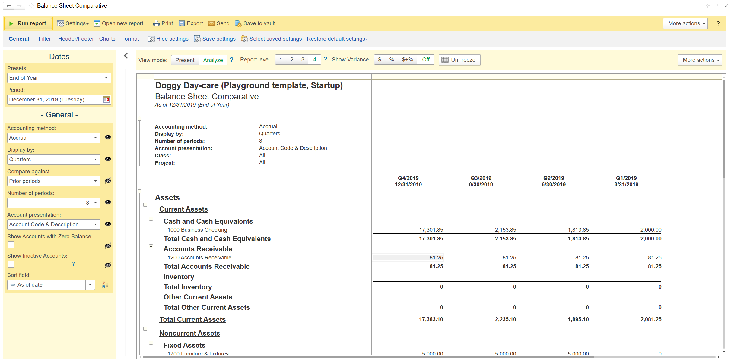 The Balance Sheet Comparative Report is the advanced version of the balance sheet in CustomBooks™. This report allows users to compare financial data over different time periods to identify trends and changes in financial position.