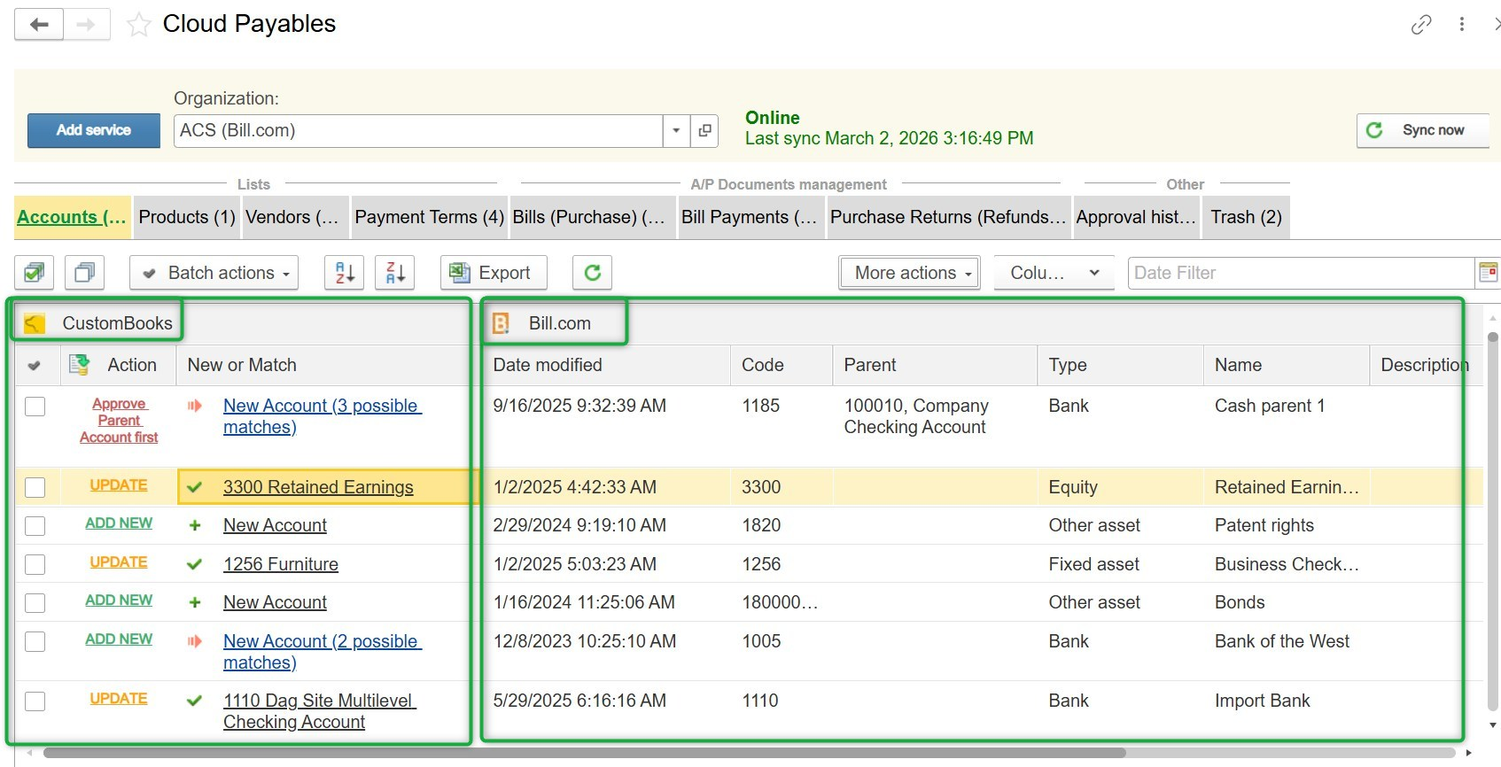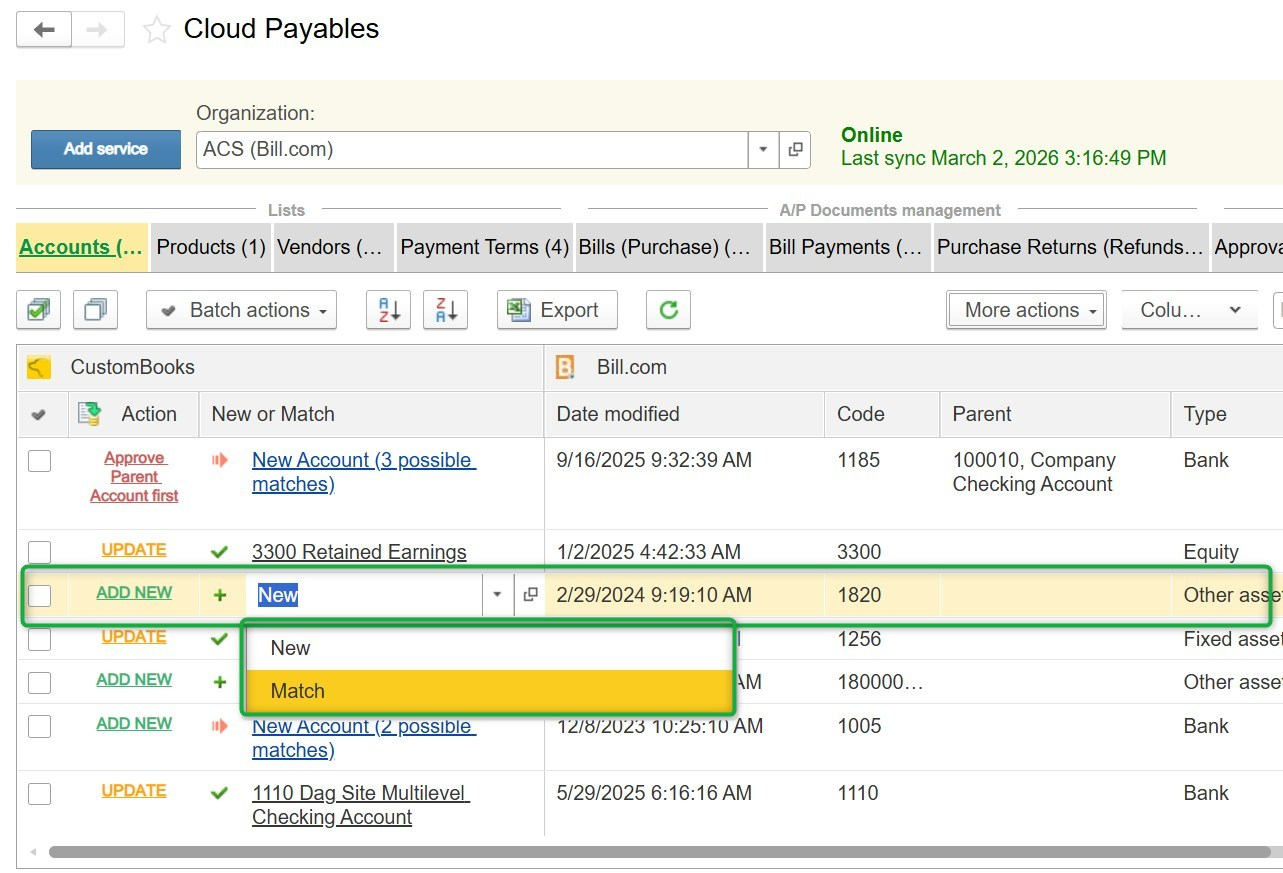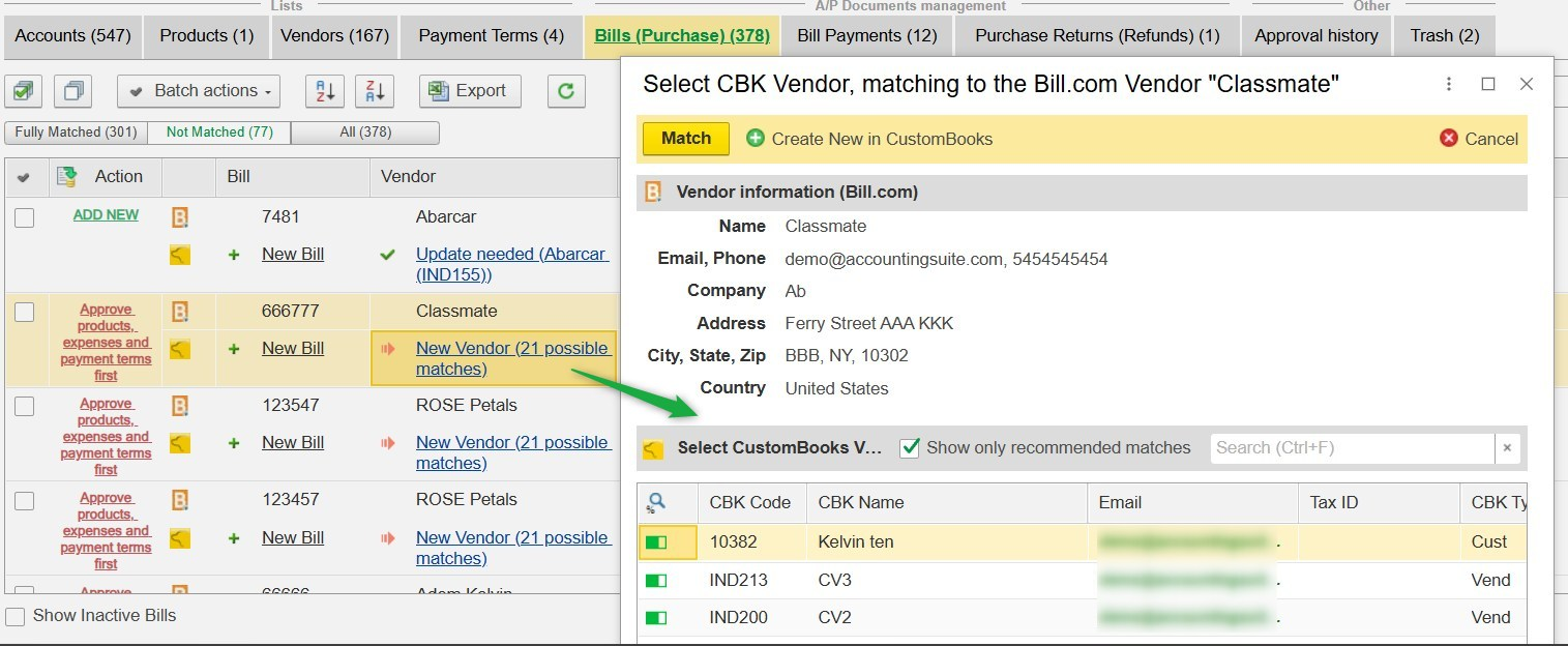 When data is received from Bill.com, the system requires mapping to corresponding records inside CustomBooks™.