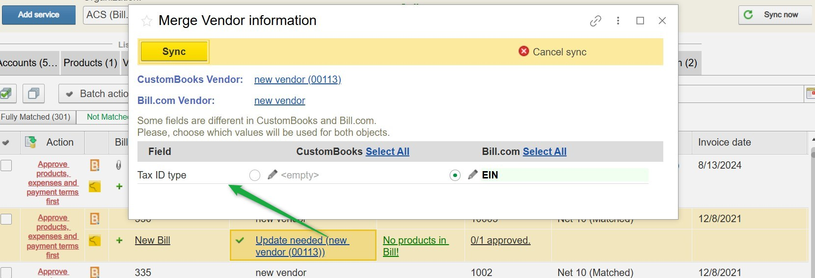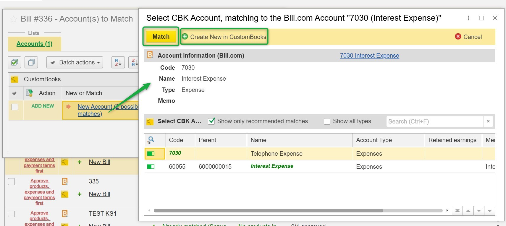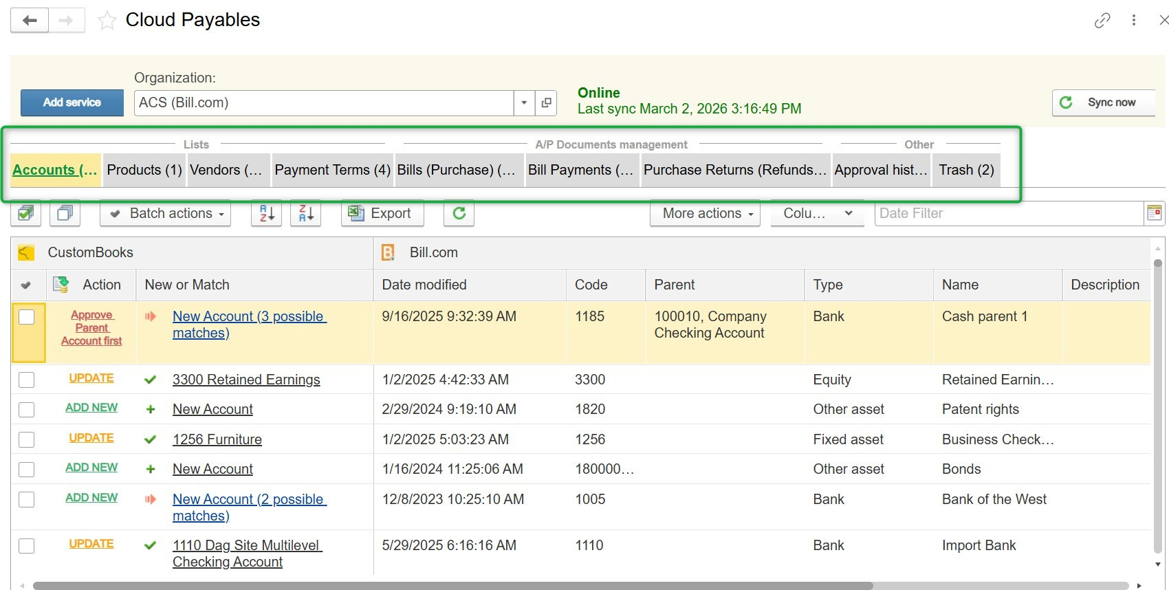 When data is received from Bill.com, the system requires mapping to corresponding records inside CustomBooks™.