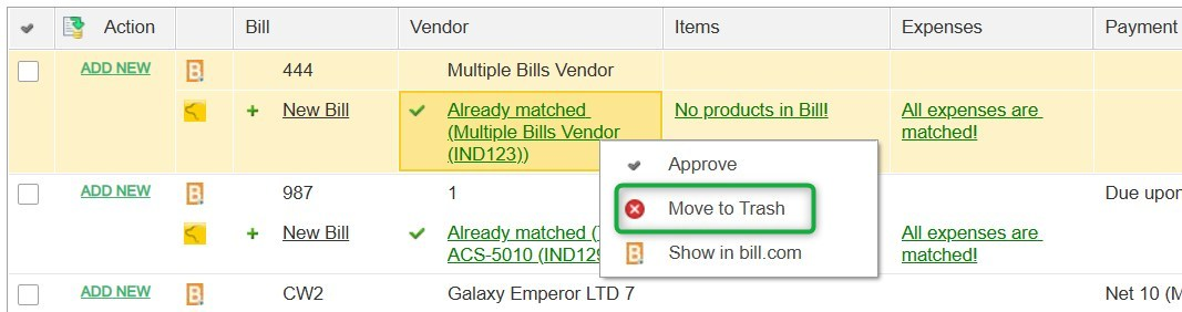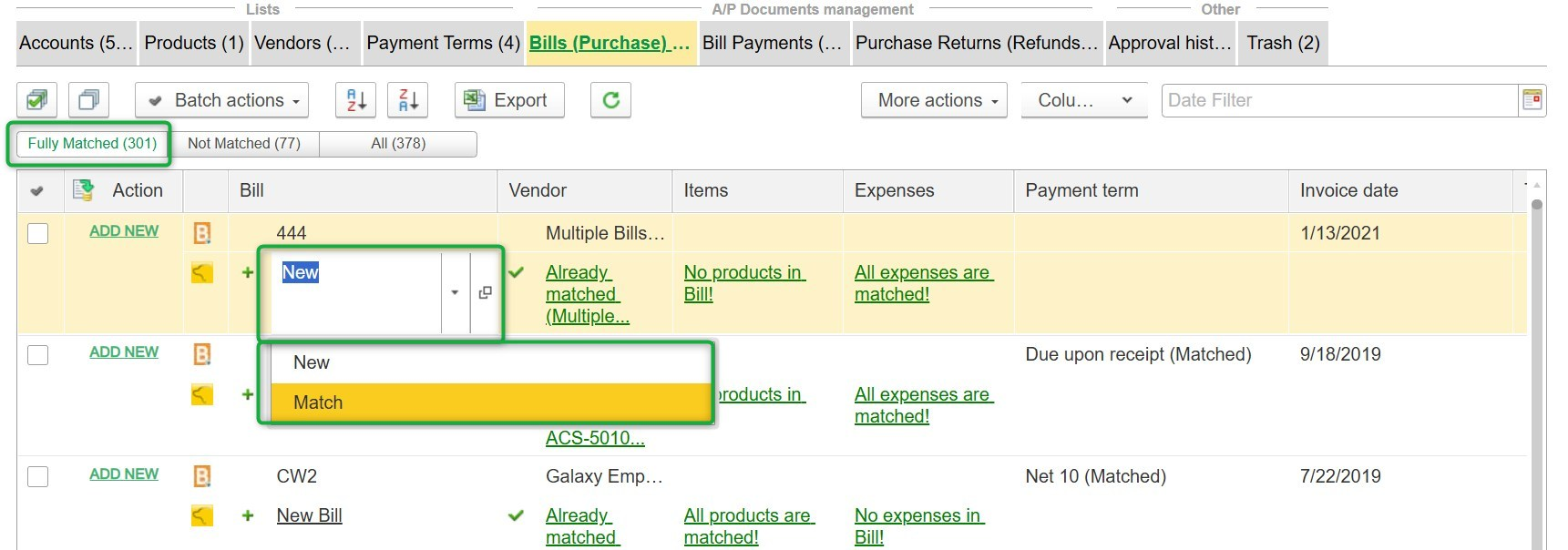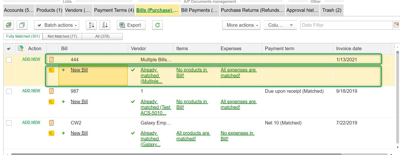 Once fully matched, click "ADD NEW" in the Actions column to approve the matching or creation of the document.