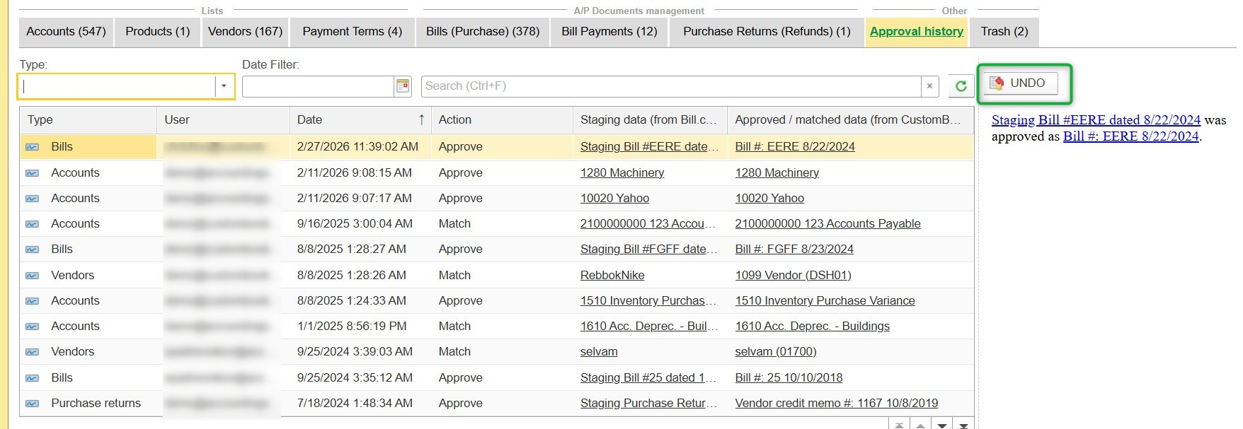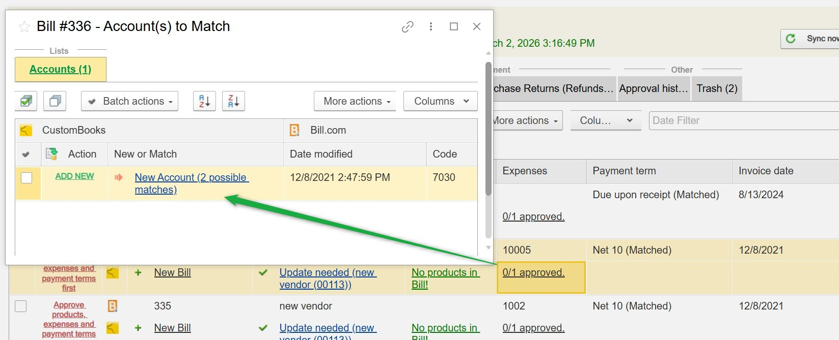 Example: On the screenshot above, Bill 336 is not ready for approval yet, as the expense account code (10005) does not exist or is not yet mapped from the record in CustomBooks™, and the vendor mapping needs to be updated first. In this case, you'll need to update or resync the vendor information and approve the account code to either match it to an existing CustomBooks™ GL account record or create a new GL account.