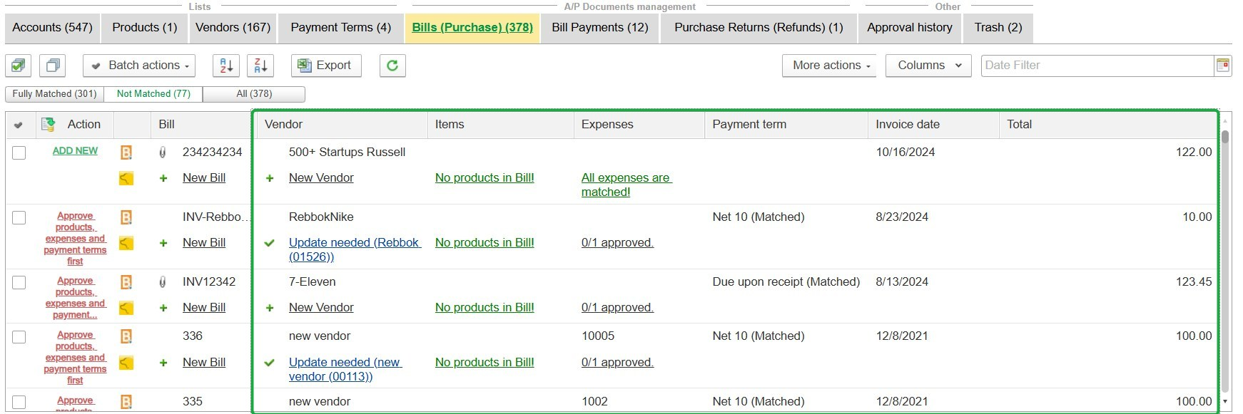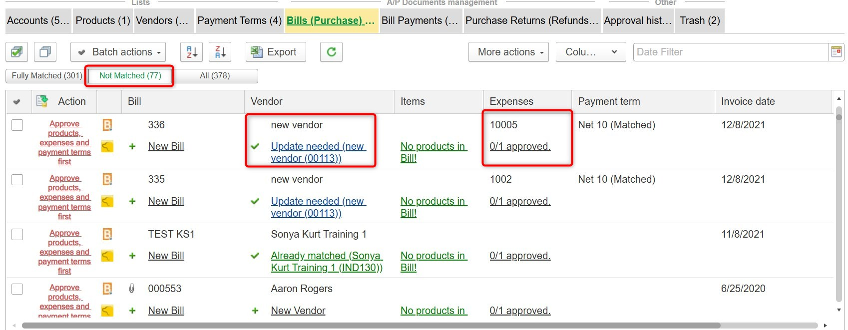 - Verify that the chart of accounts and payment terms are correctly configured for all vendors.