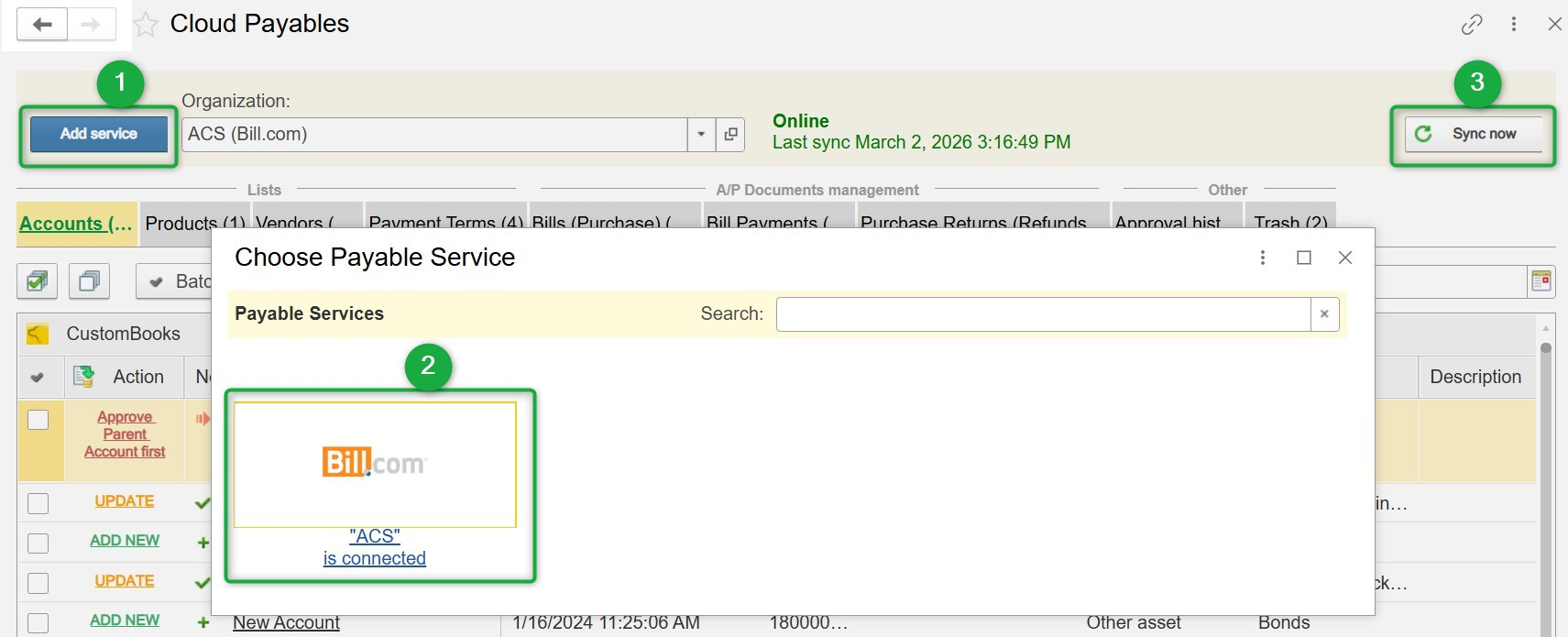 Overview The Bill.com integration in CustomBooks™ connects your Bill.com account to manage Accounts Payable (A/P) data within CustomBooks™. This integration allows you to sync vendors, bills, payments, products, and related A/P data between Bill.com ...