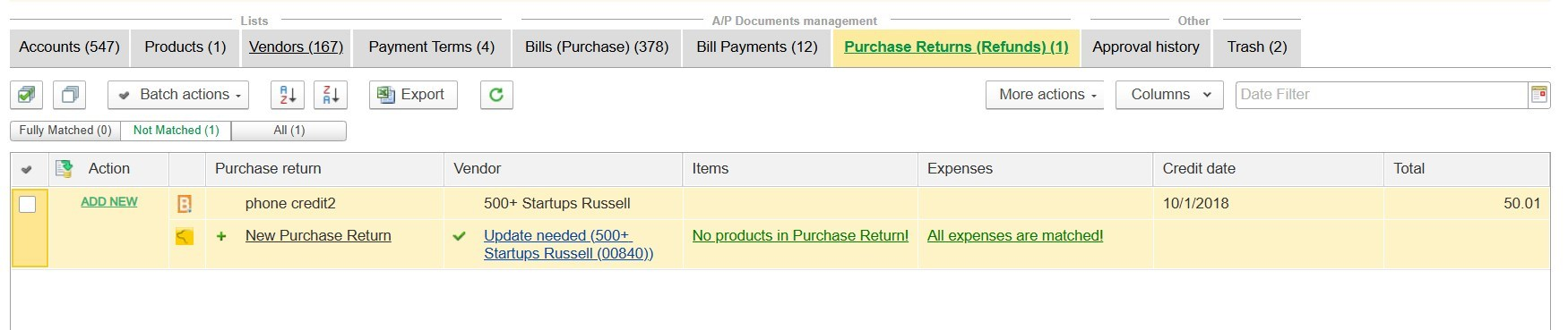Matching Purchase Returns