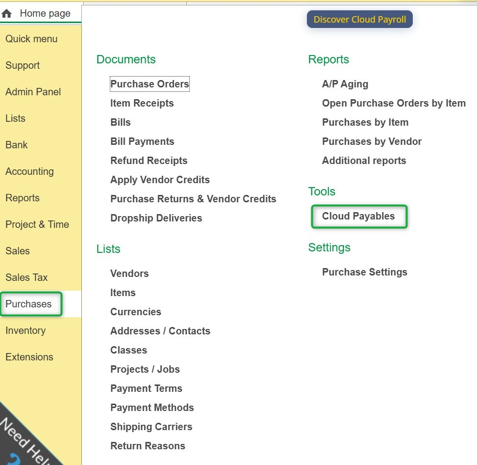 From the left side menu panel, navigate to the Purchases module → Cloud Payables.