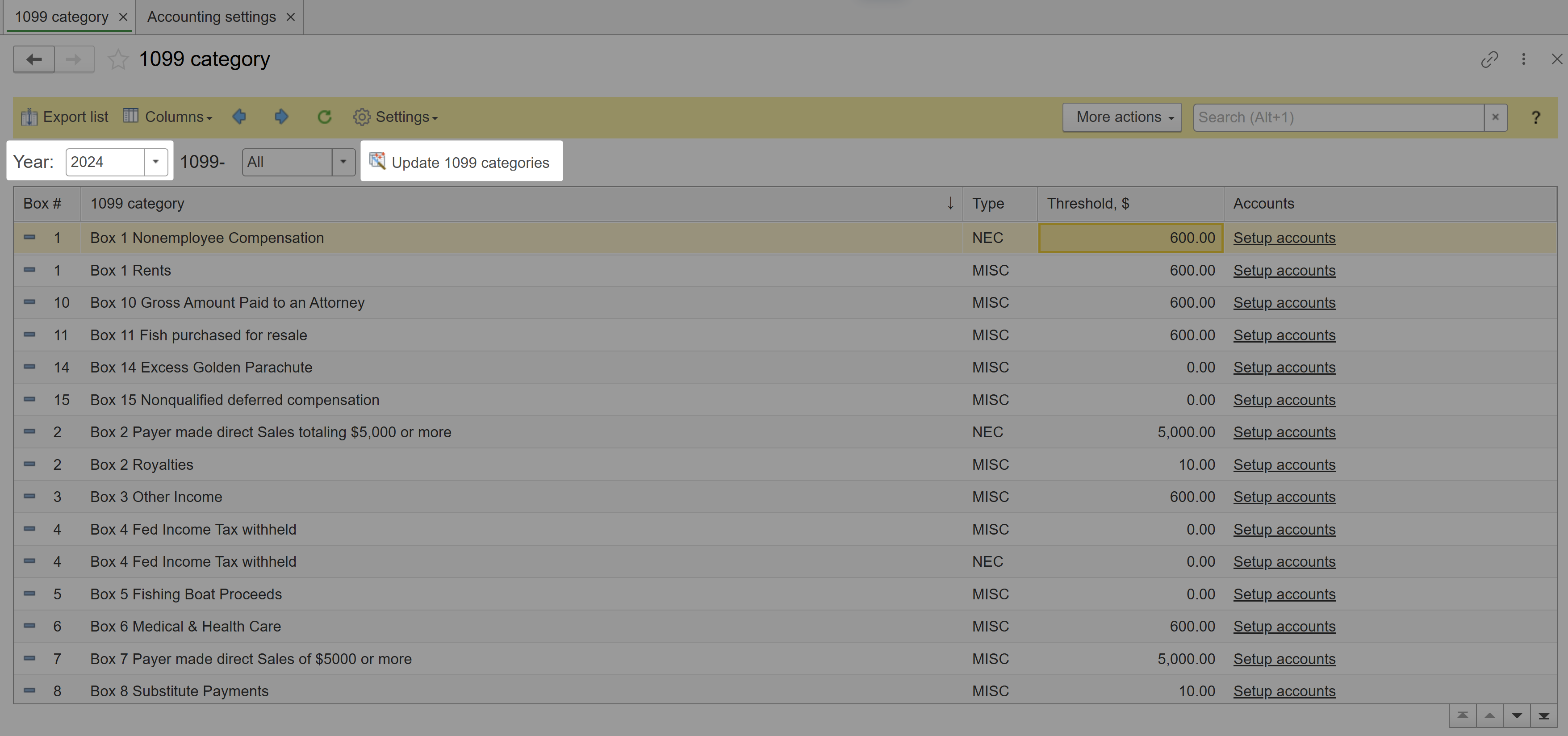 To update your 1099 settings, you can navigate to Accounting > Accounting Settings > 1099 Settings and then set 2024 as the latest year for the 1099 Report and Tax Lines settings. An update wizard will appear when you select the current year, and this will walk you through any changes that might need to be made. Alternatively, you can also navigate to Lists > 1099 Categories to update to the current year and review your mapping and settings.