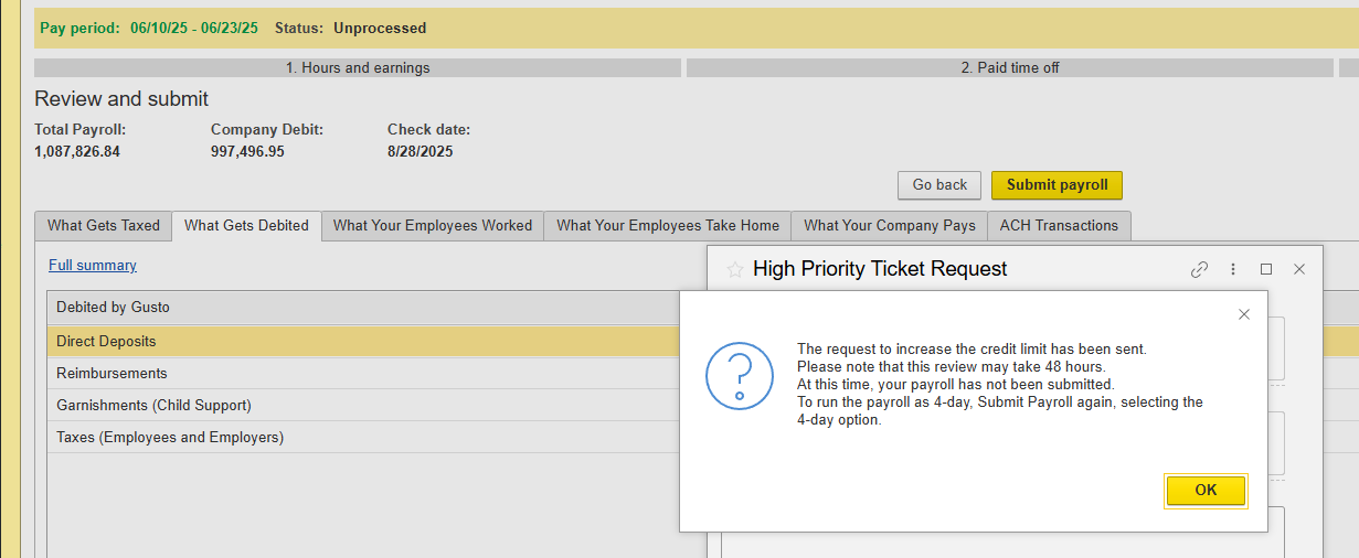 Cloud Payroll User-Messaging: We have improved the user messaging for when a 2-day payroll credit limit is exceeded. The new message will now include the steps for users to submit a 4-day payroll while their credit limit increase is being reviewed.