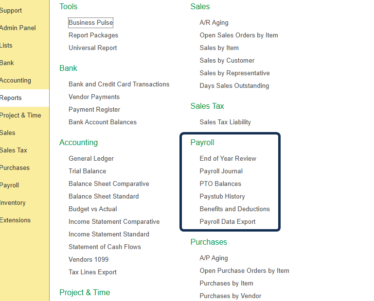 Cloud Payroll Reports: Users with Cloud Payroll access can now open payroll reports from the Reports menu. These reports will continue to be available under the Payroll menu as well.