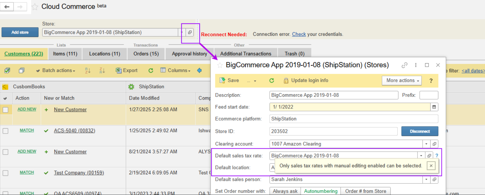 - Messages that clarify that only sales tax rates with manual editing enabled can be used.