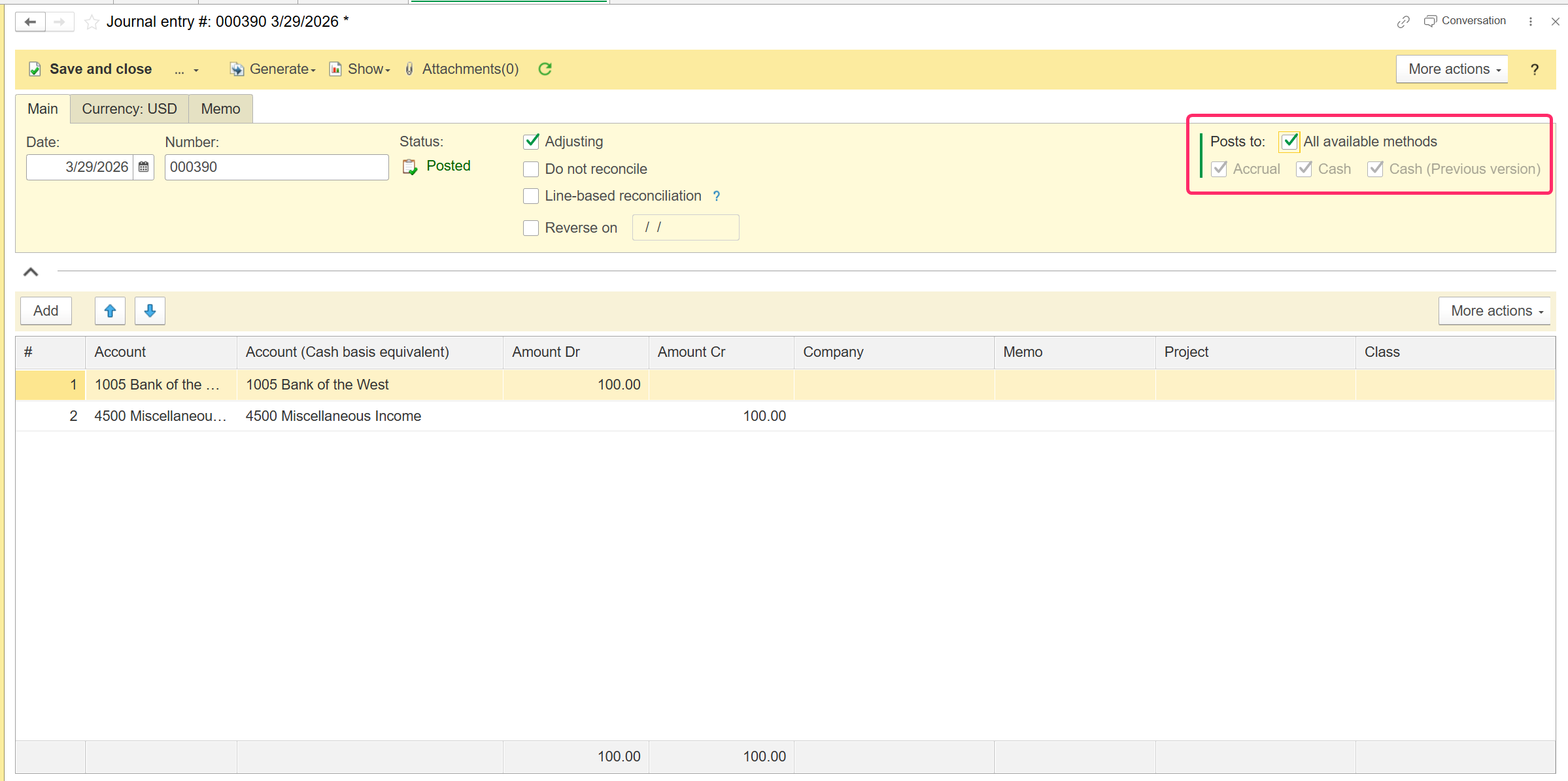 - Intentional Adjustments: To change the accounting method, you must first toggle the "Adjusting" checkbox. This reveals four specific posting options: