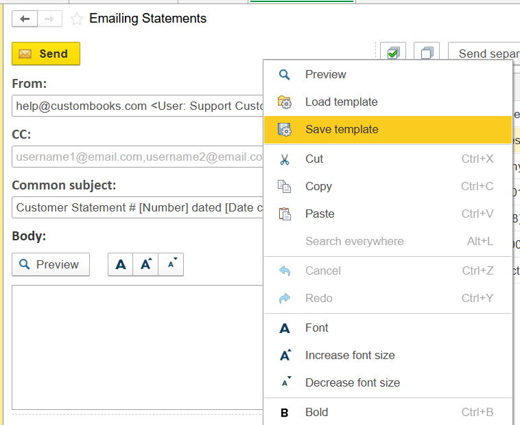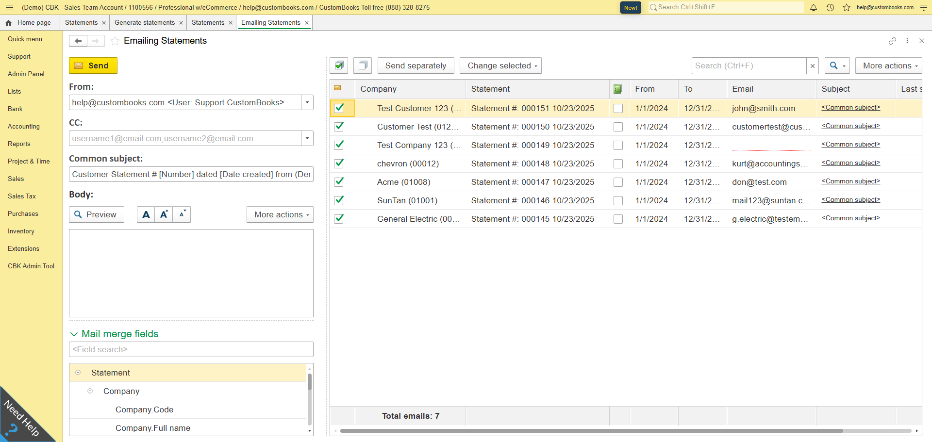 The Emailing Statements window will open, on this part you can add CC email, change Common Subject, deselect and re-select statements and add personalized email body by adding Mail Merge Fields.