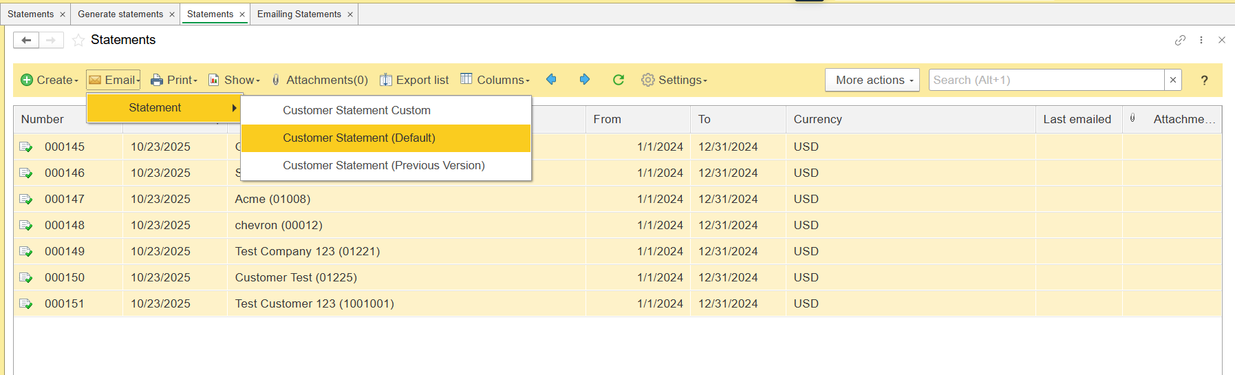 Select the Customer Statement/s that you want to email (to select or highlight multiple statements, press the Shift Key + Left Click the Statement/s), then click Email and select an email template the use.