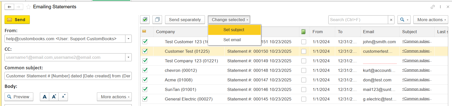 - You can change the subject and email of a selected company individually in the Statement Information by clicking Change Selected dropdown.
