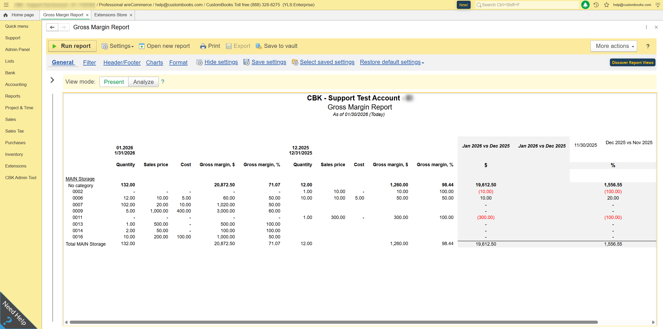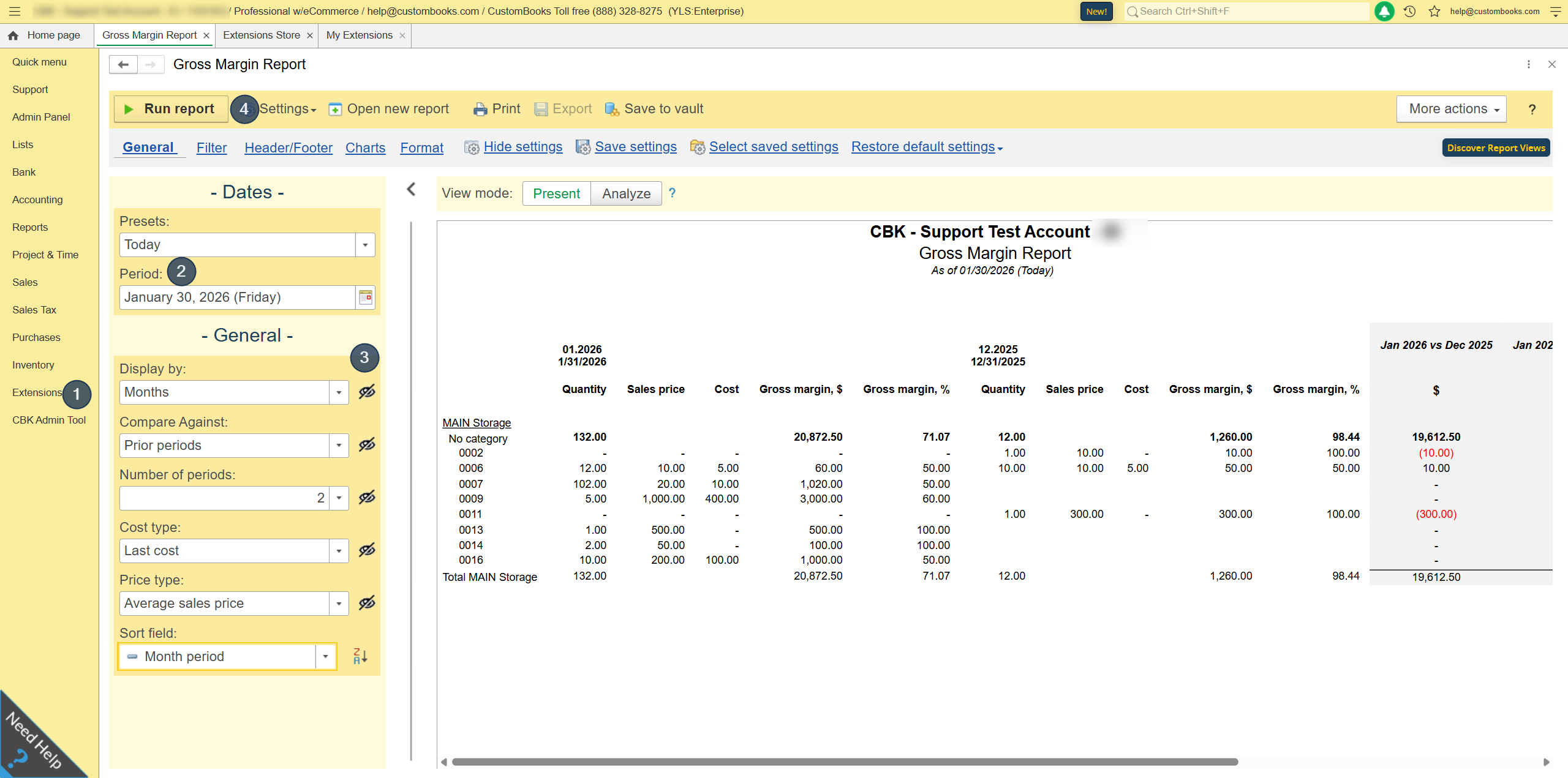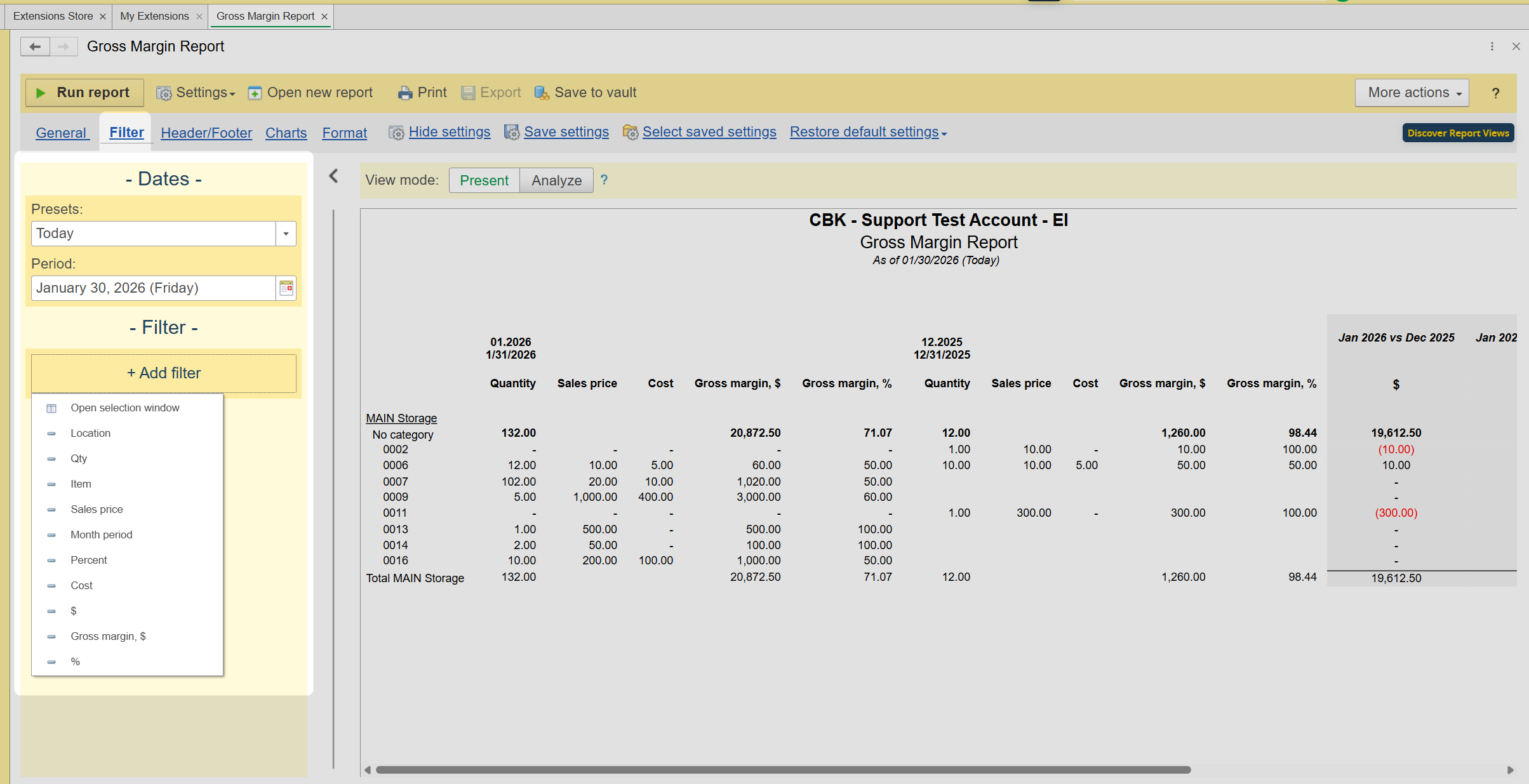 - From the Extension Store: Navigate to Extensions → Extension Store. Double-click Gross Margin Report and click Run Report.