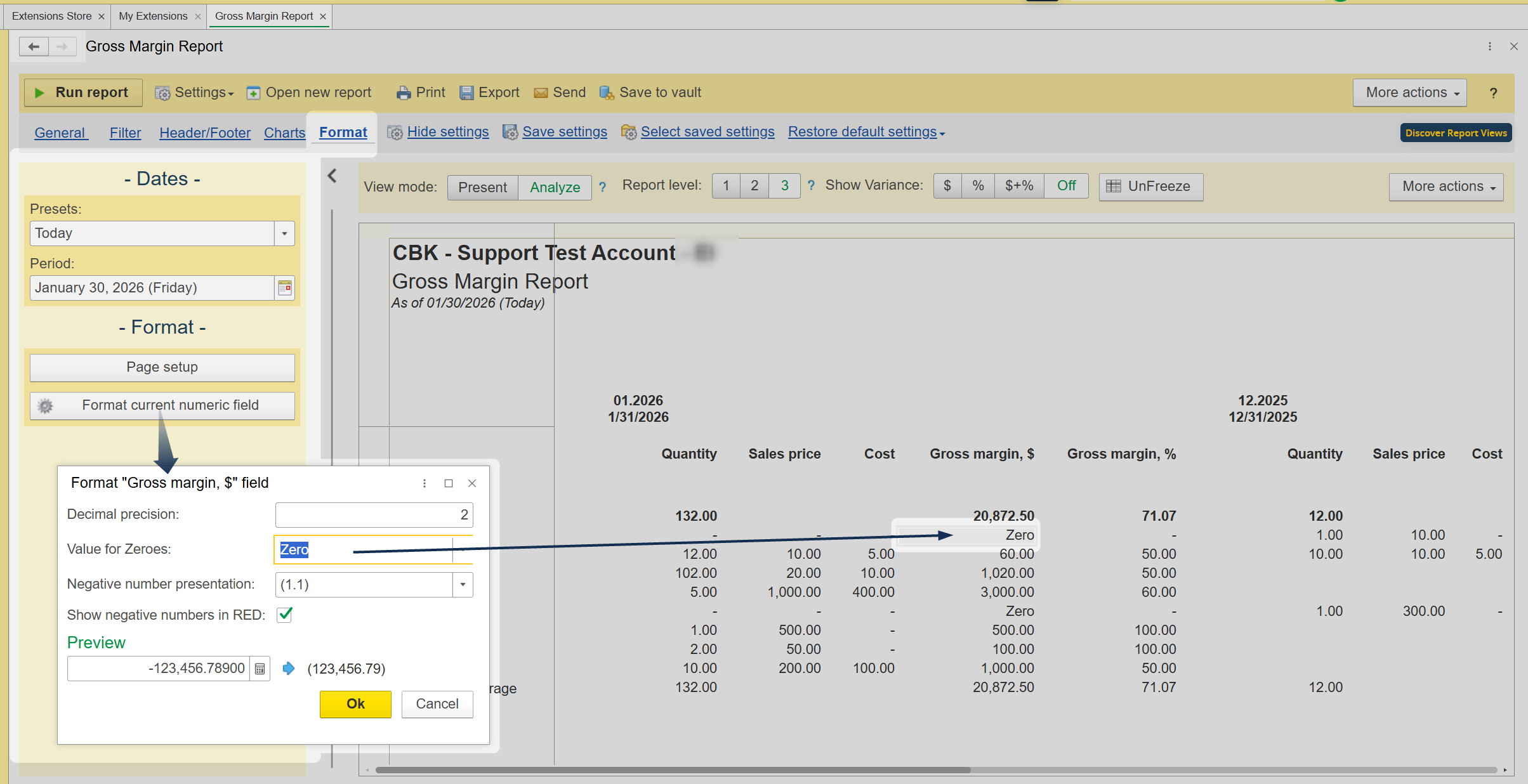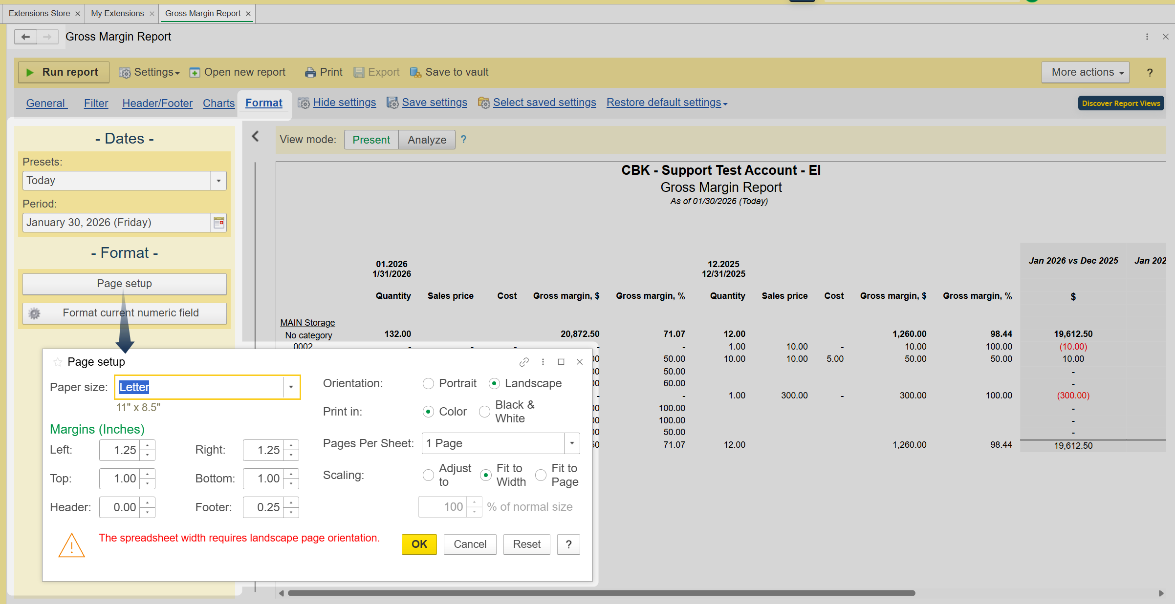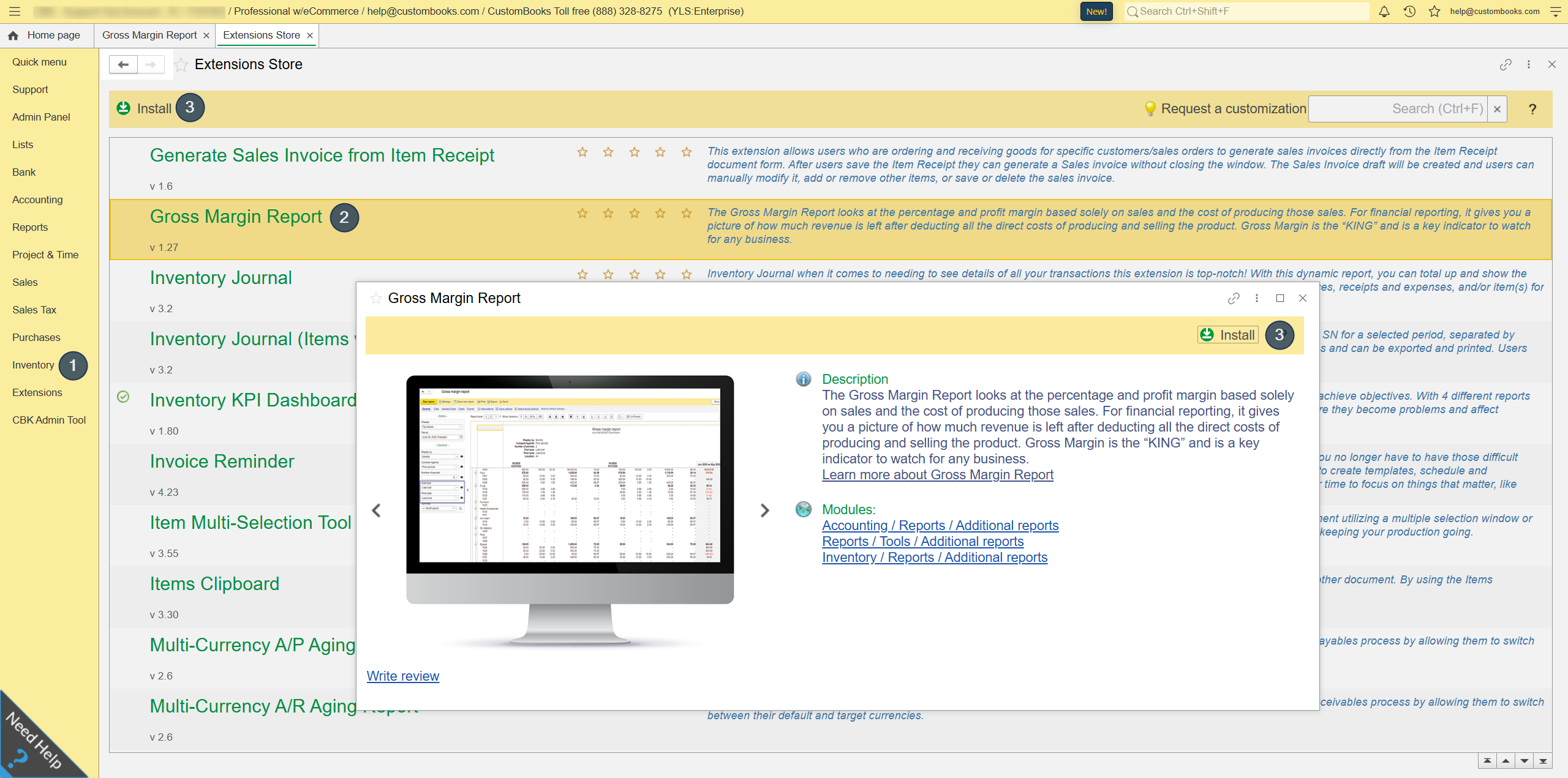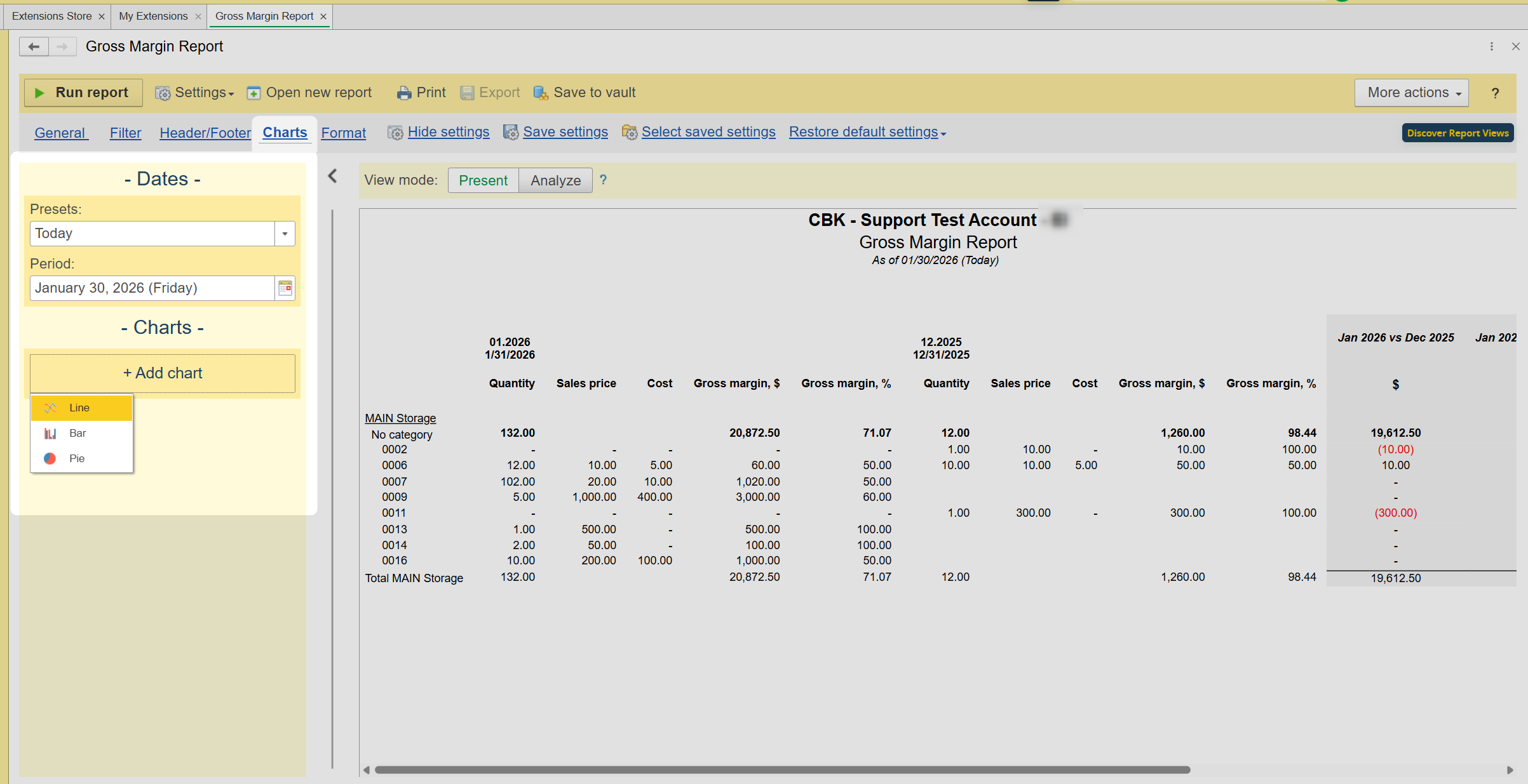 - From the Extension Store: Navigate to Extensions → Extension Store. Double-click Gross Margin Report and click Run Report.