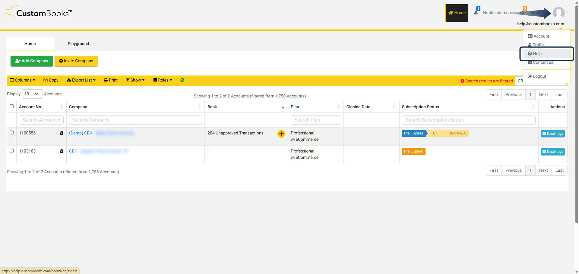 - From the CustomBooks™ Dashboard/Client Portal: Click your avatar or your user email address dropdown in the top-right corner, and then select Help.