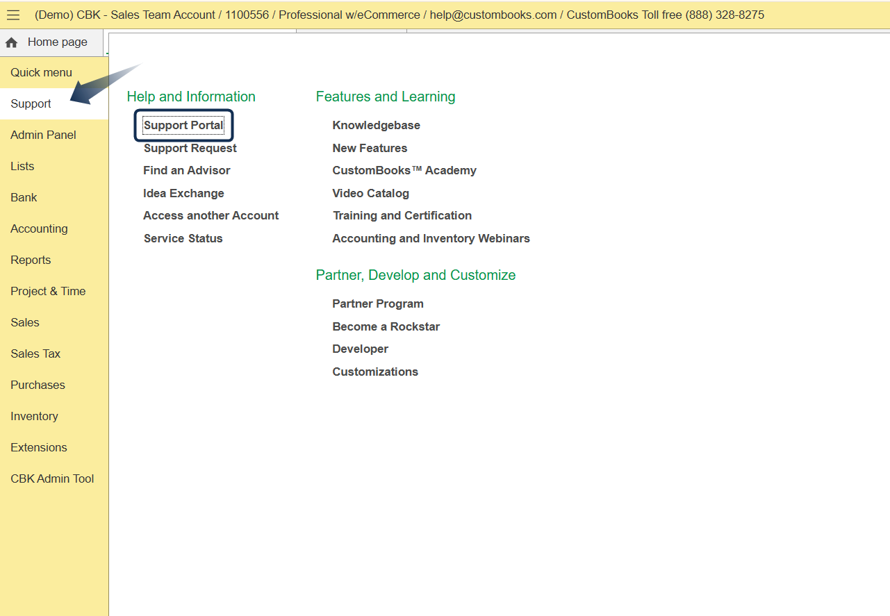 - Within the CustomBooks™ application: Navigate to Support > Support Portal.