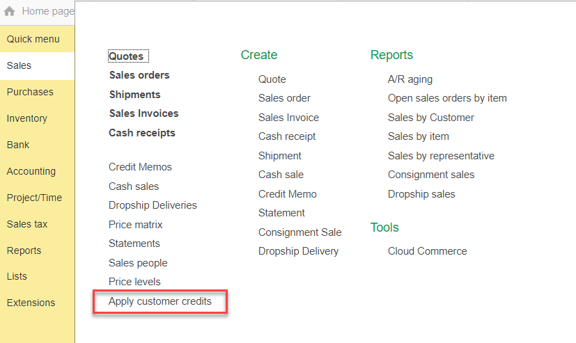 The Apply Customer Credits feature can be accessed from the Sales Menu (Apply Customer Credits) or the Create Menu in Companies.