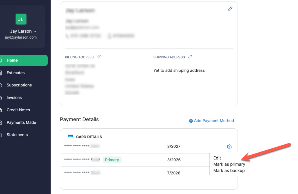 Click the gear icon next to the card you'd like to make the primary card and choose make primary.
