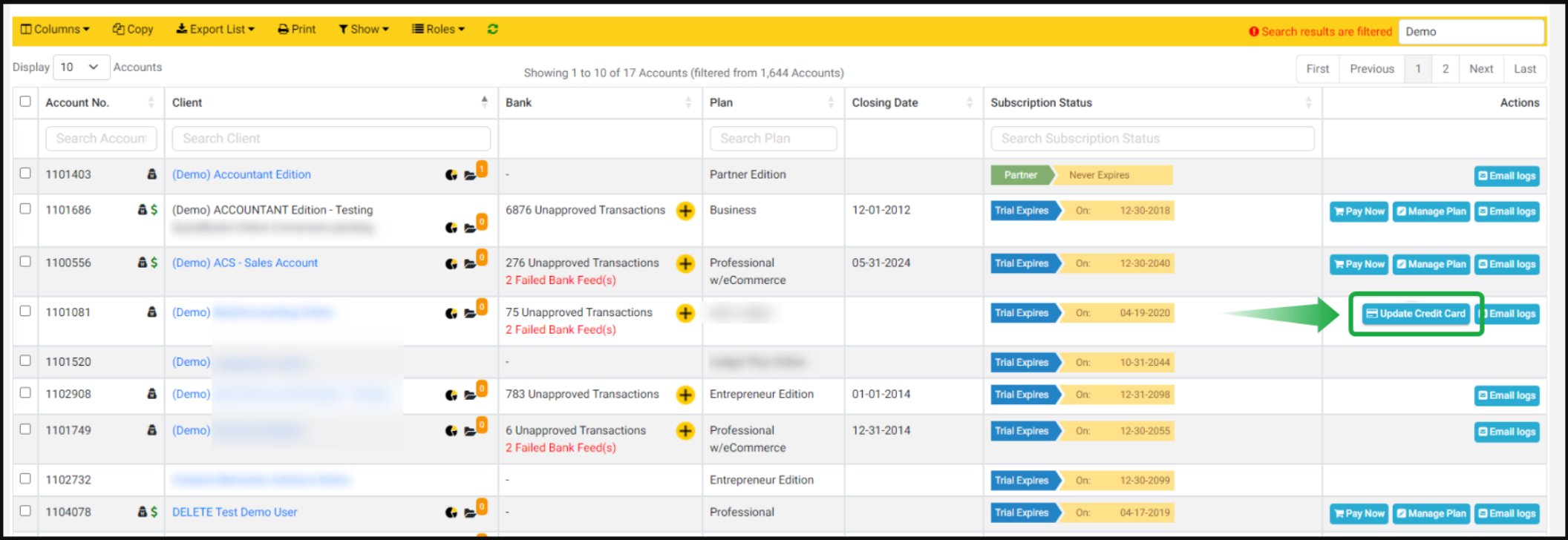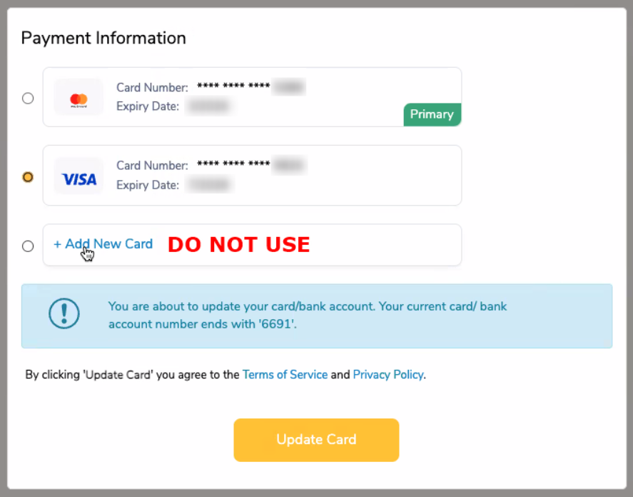 Note: When updating a payment method from the CustomBooks™ Portal/Dashboard, do not use the 'Add New Card' button, as it will apply the new card to all subscriptions. Go to the Billing Portal to add a new card.