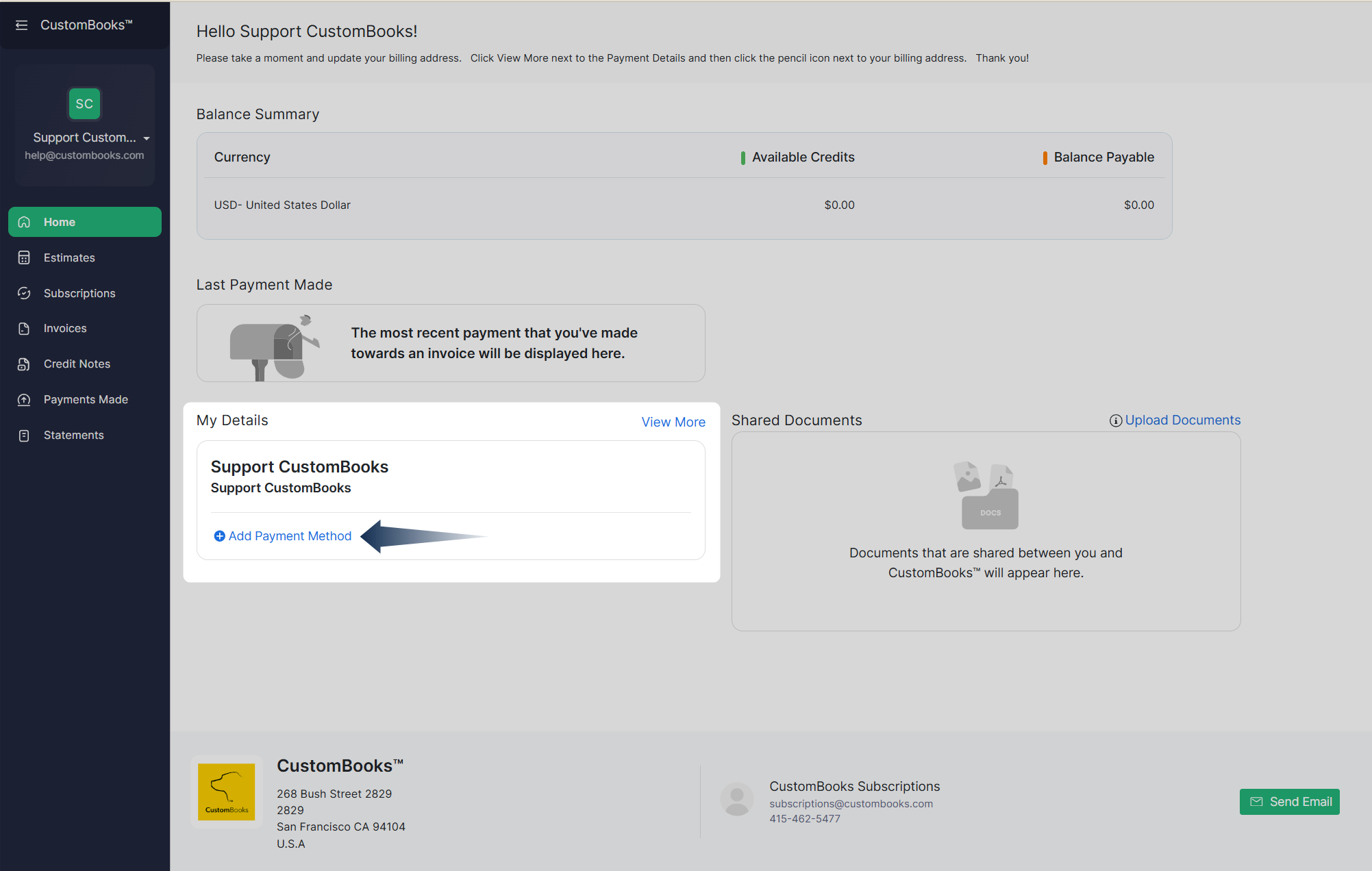 - From the Billing Portal Home Page, click Add Payment Method in the My Details section.