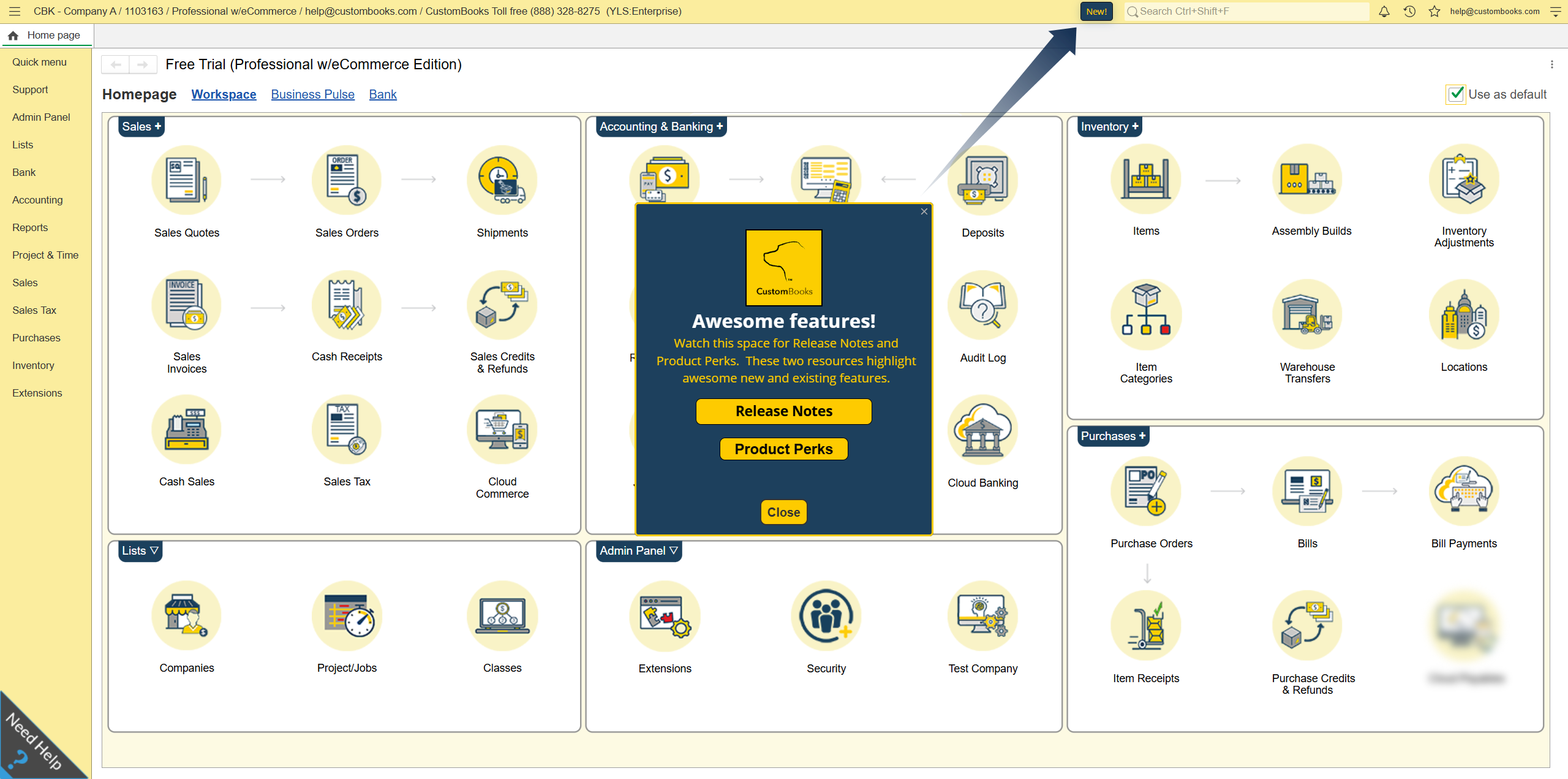 - A pop-up window titled "Awesome features!" will appear. Click either the Release Notes or Product Perks button to view the respective updates.