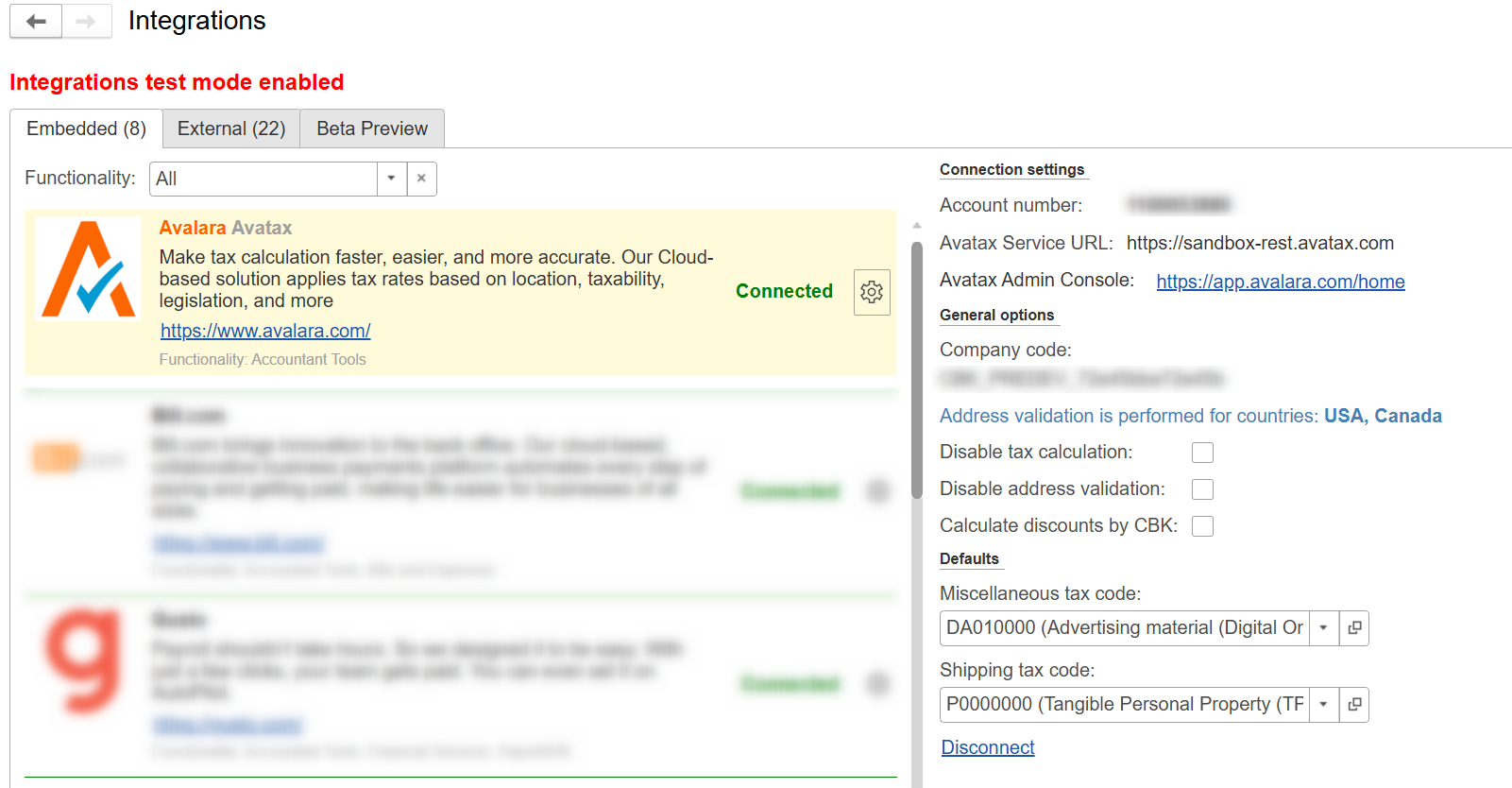 - Any tax rule adjustments must be configured directly in your Avalara account.