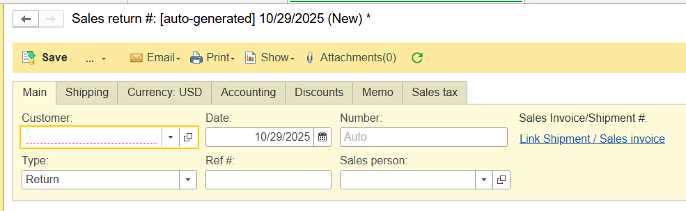 Sales Return #: Enter manually or let the system auto-assign.