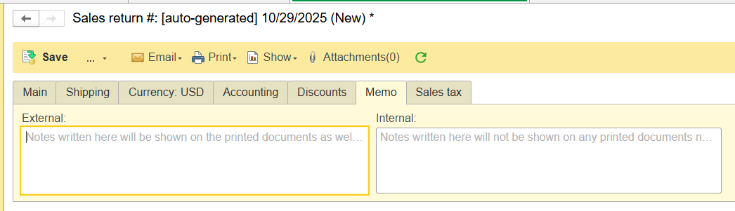 Add an External Memo (visible on printed memos) or Internal Memo (internal use only).