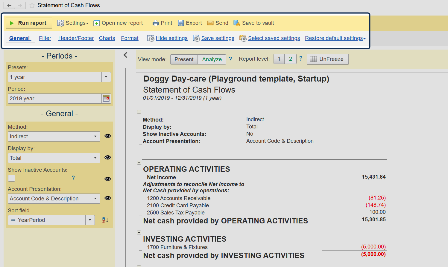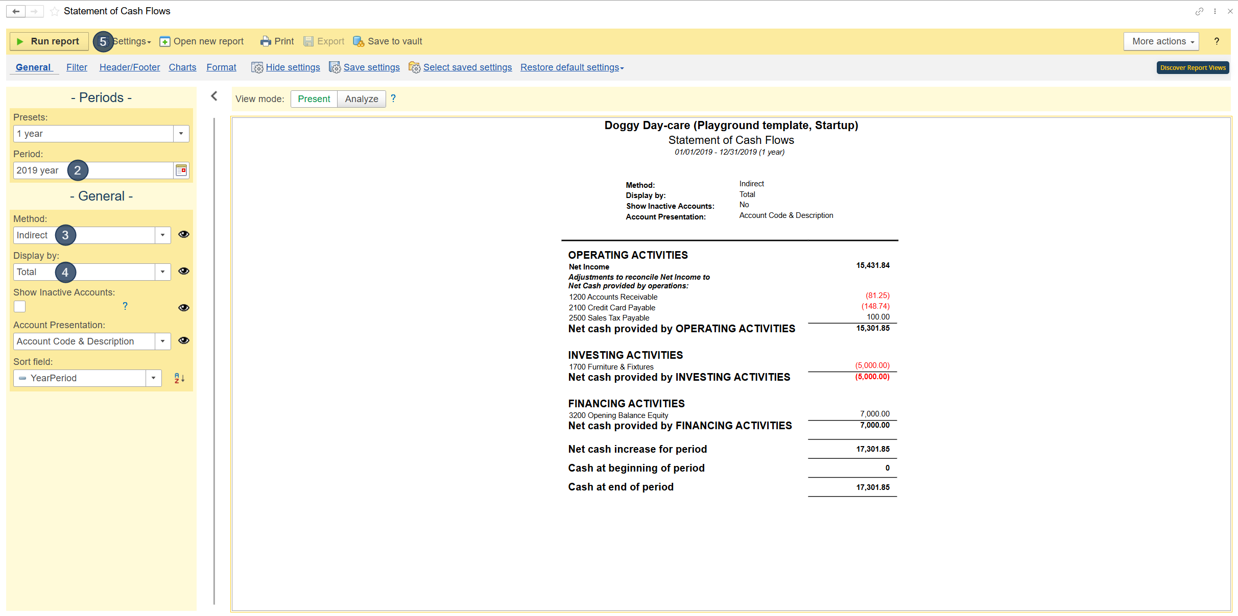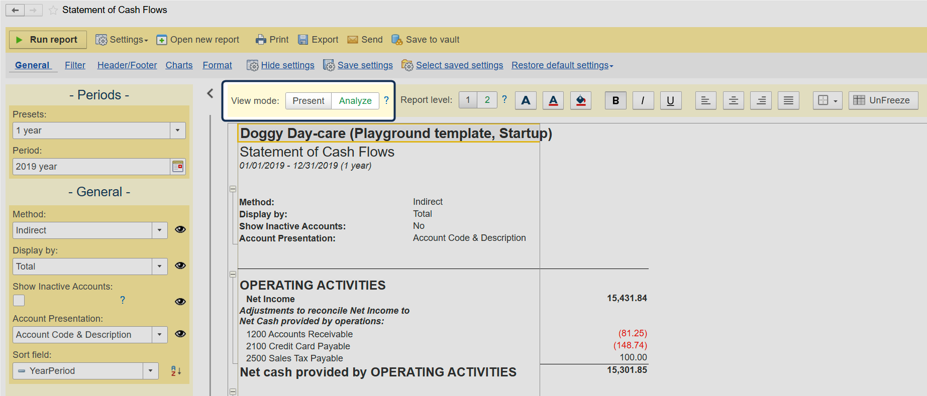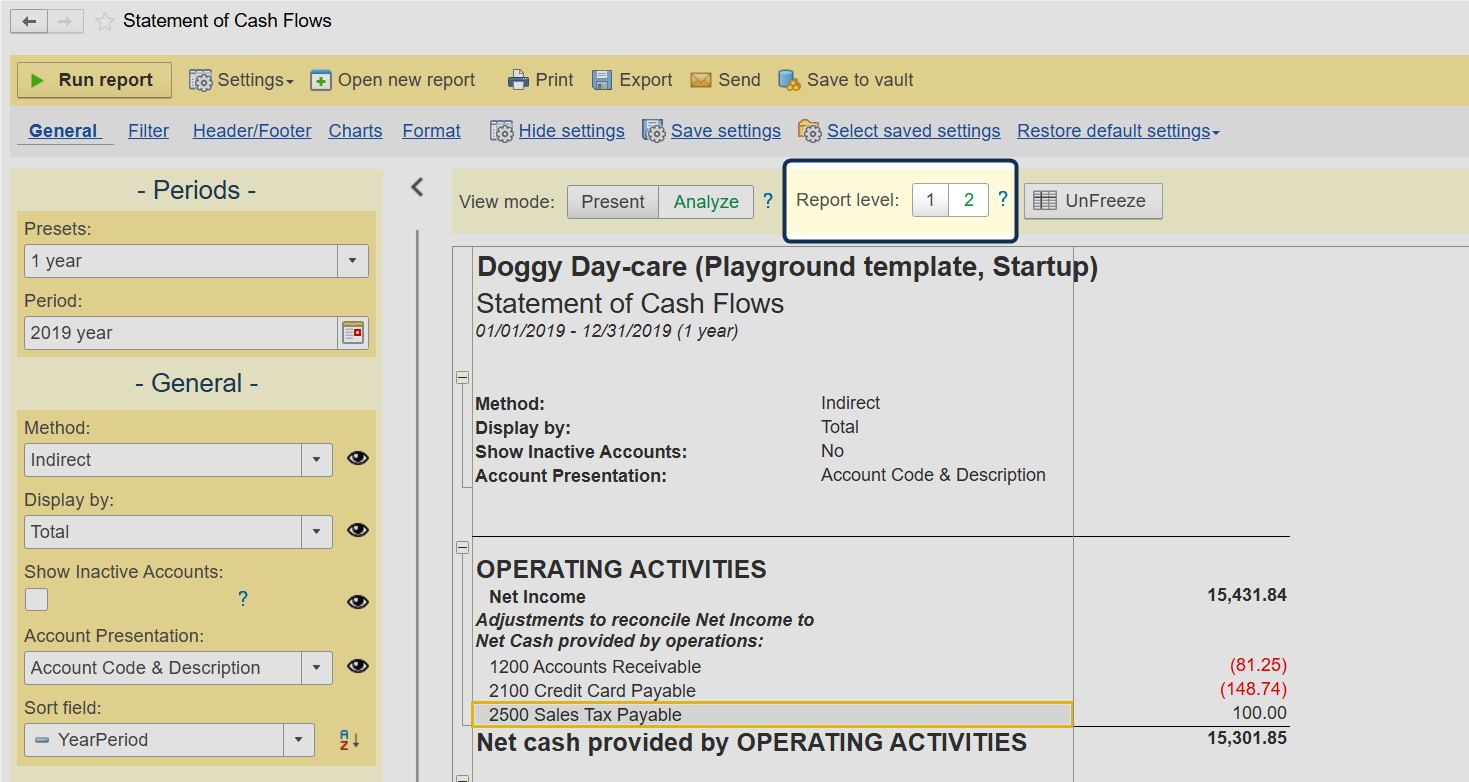 - Report Level 1: Displays only the totals of the activities, Net cash increase for the period, and Net cash at the beginning and end of the period.