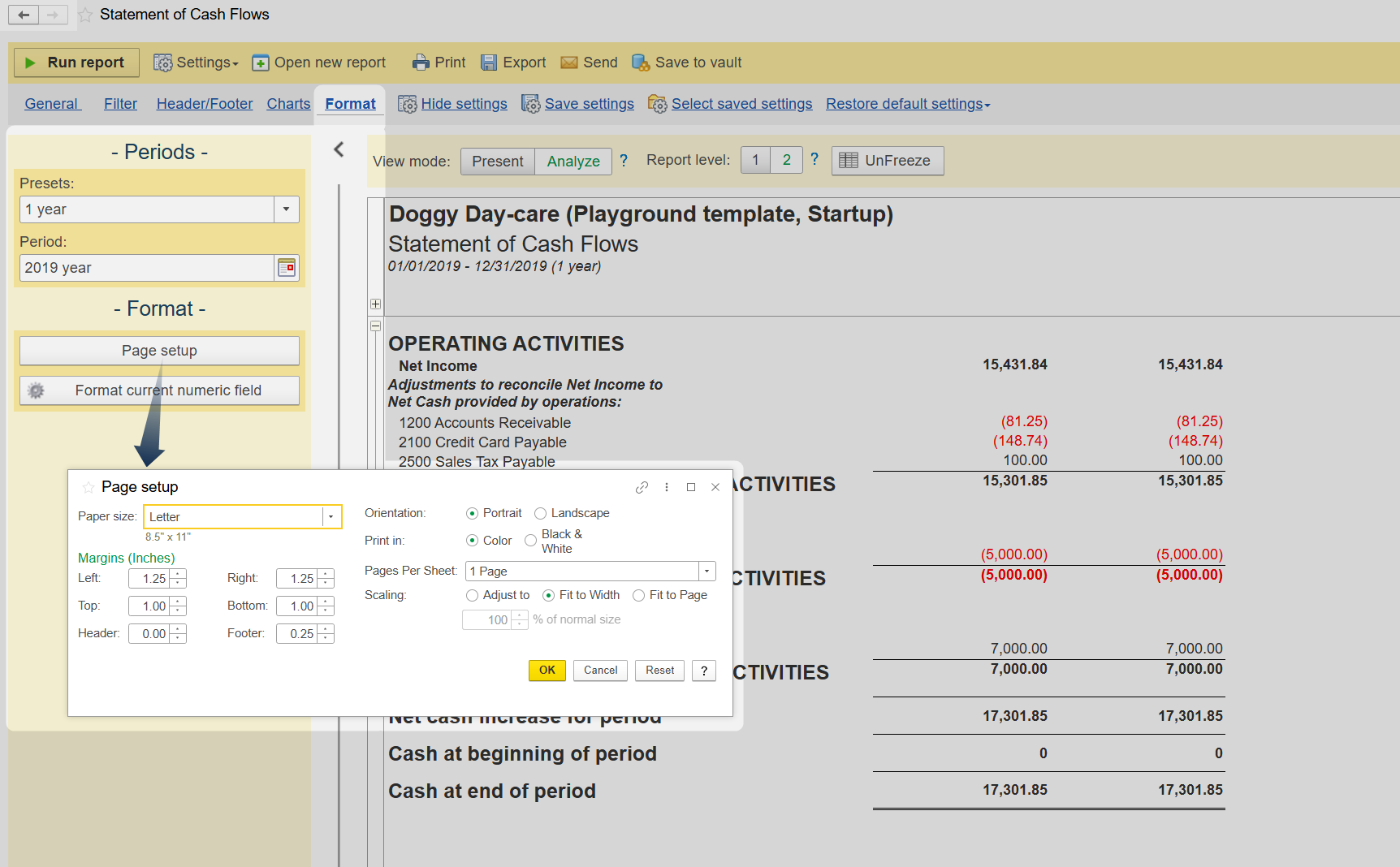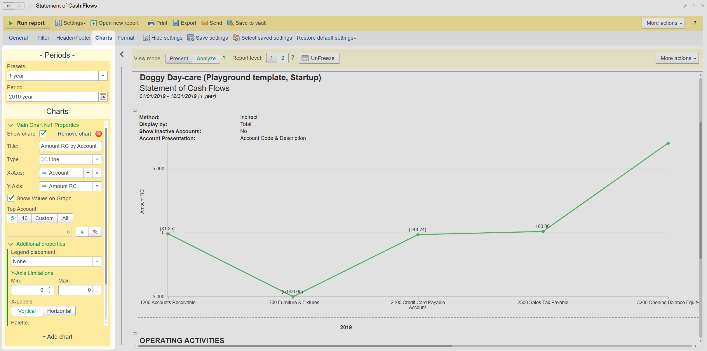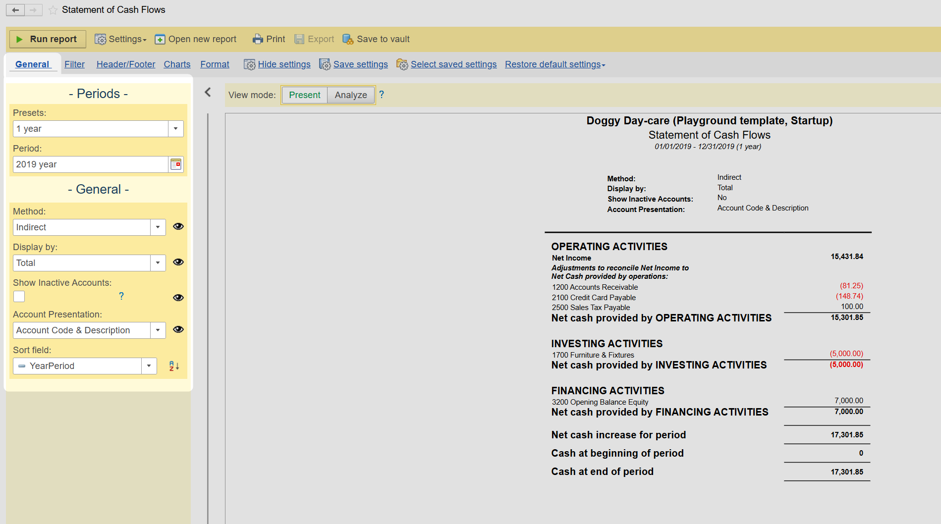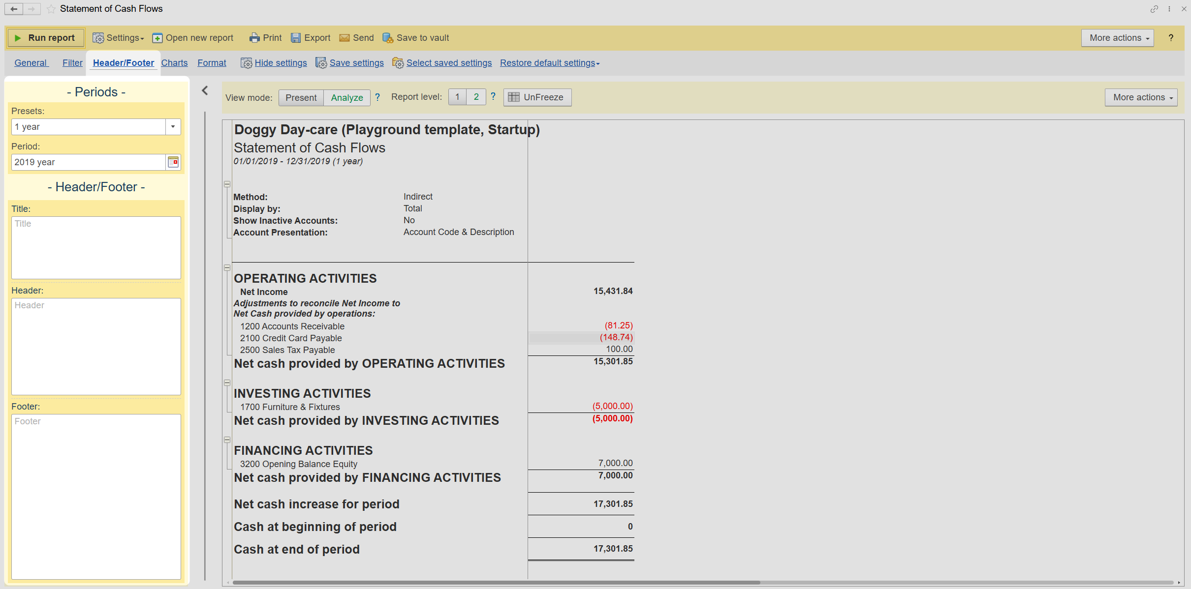 - Report Level 1: Displays only the totals of the activities, Net cash increase for the period, and Net cash at the beginning and end of the period.