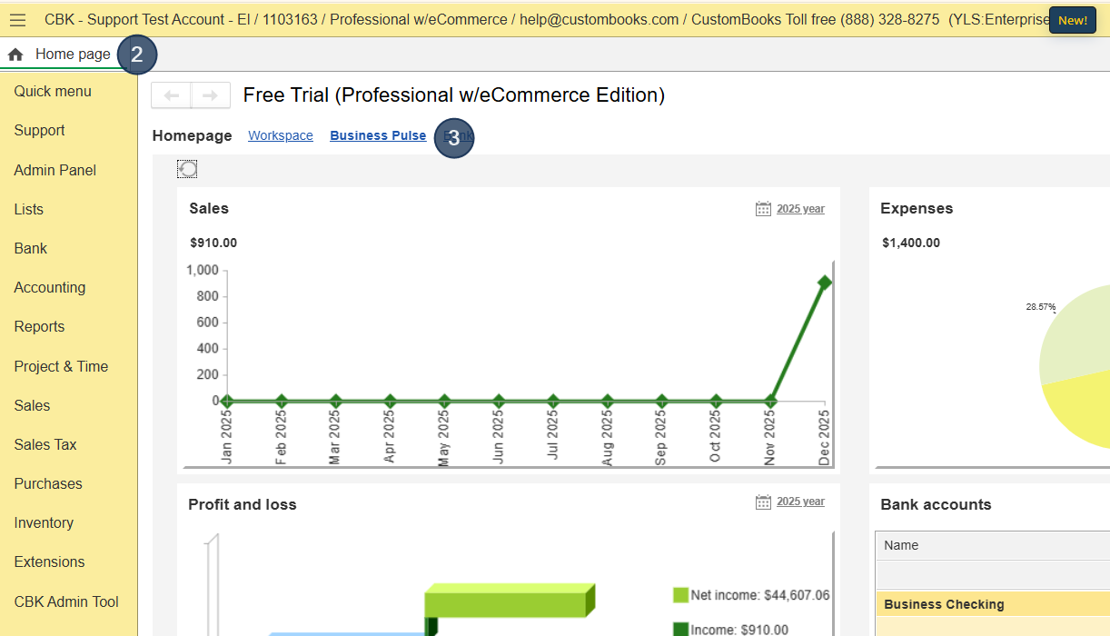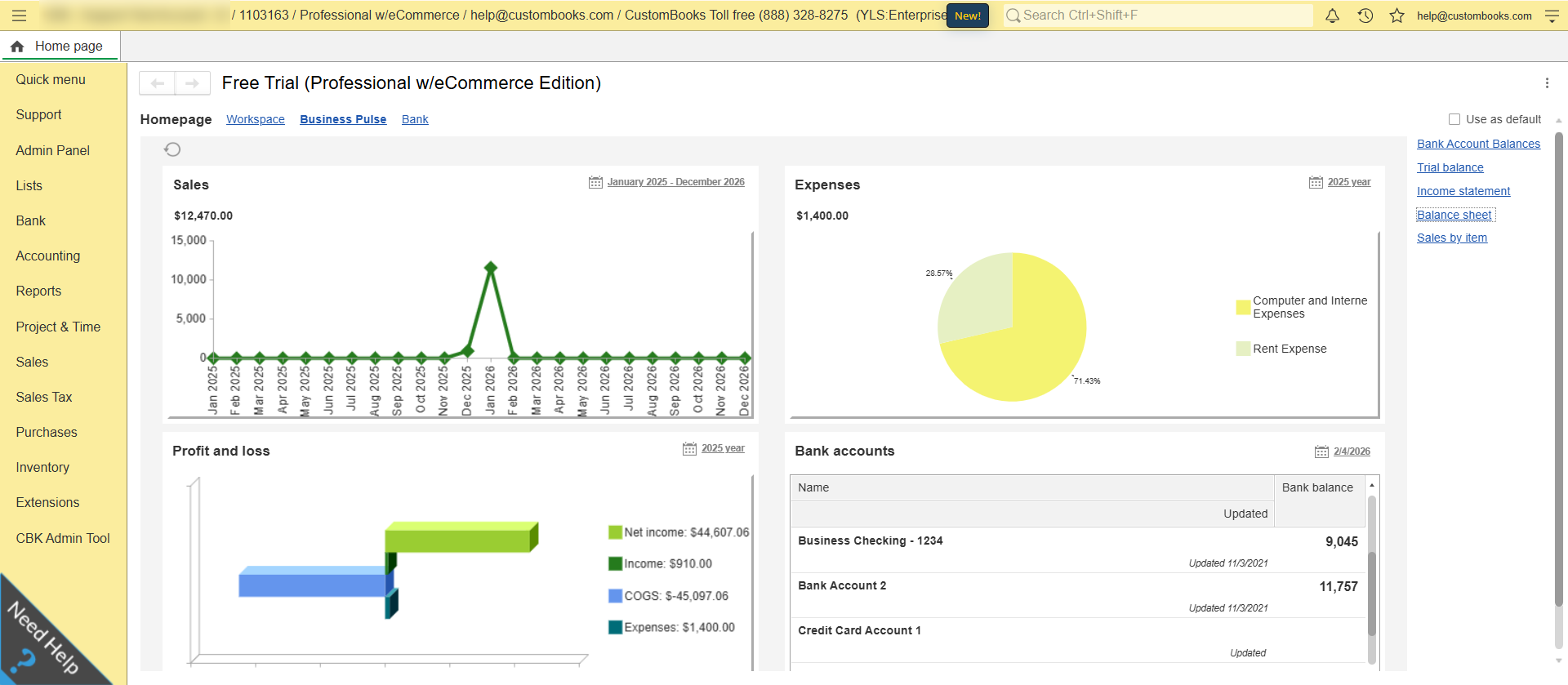 The Business Pulse dashboard in CustomBooks™ serves as your financial command center. It provides a real-time, visual snapshot of your company's health, allowing you to monitor sales trends, expense breakdowns, and bank balances at a glance without running complex reports.